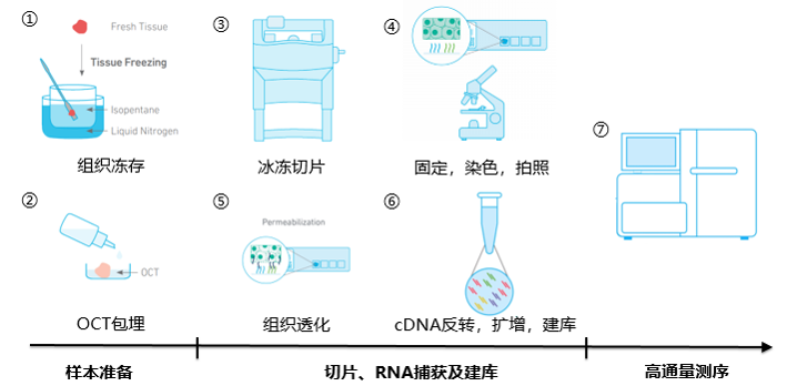 總體來說,空間轉錄組的實驗流程包括:組織凍存-OCT包埋-冷凍切片-固定染色-組織透化-cDNA合成及建庫-上機測序,而需要客戶進行樣本準備的步驟相對簡單:組織凍存與OCT包埋。