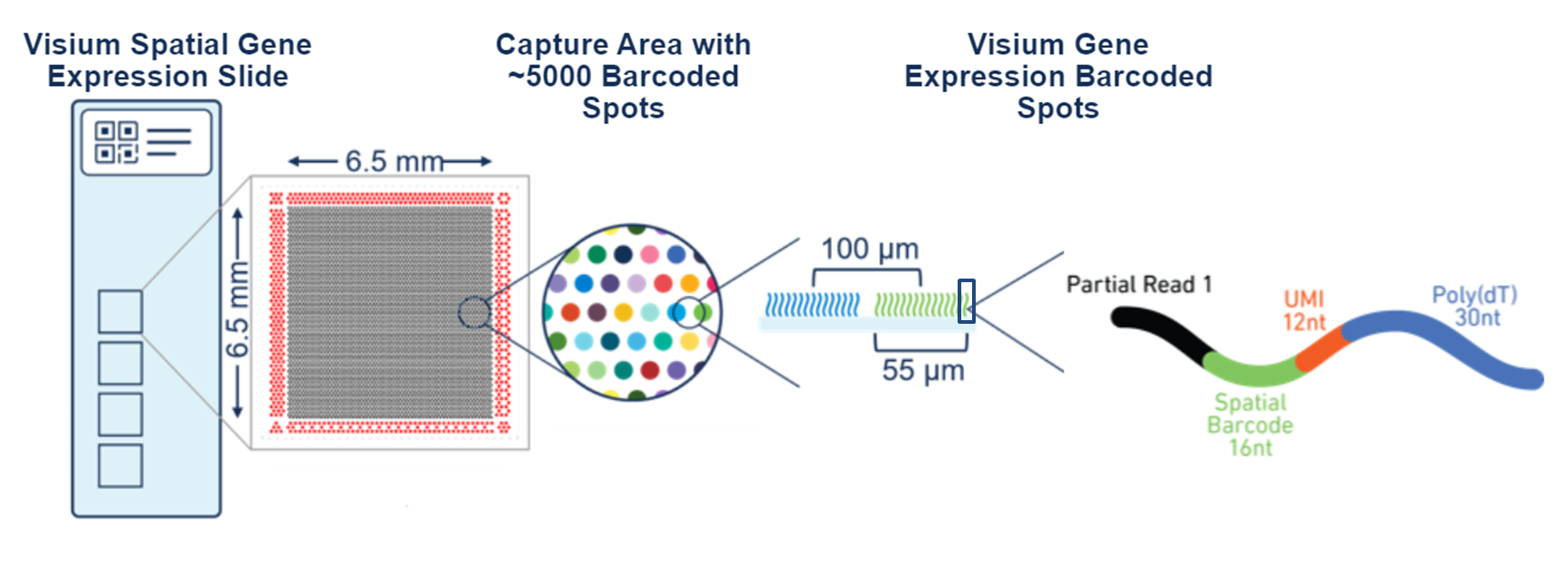 Visium空間轉錄組的核心在于載玻片部分,正式文庫構建的載玻片上有4個捕獲區(qū)域(6.5mm X 6.5mm,可以加4個樣本),每個捕獲區(qū)域含有約5000個被條形碼標記的點(barcoded spots),每個spot直徑55μm,spot與spot中心點之間的距離為100μm,每個 spot含有上百萬個可以與mRNA結合的捕獲探針,每個探針上都帶有獨特的spatial barcodes,用以標記捕獲的mRNA的空間位置。