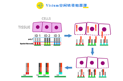 當組織冷凍切片附在帶有spatial barcode的空間轉錄組載片上時,通過探針上條形碼引物結合并從組織中捕獲鄰近的mRNA。被捕獲的mRNA開始逆轉錄,得到的cDNA中包含了spatial barcode序列。通過上機測序,可以將每個mRNA轉錄的序列映射回組織切片中的起始位置。