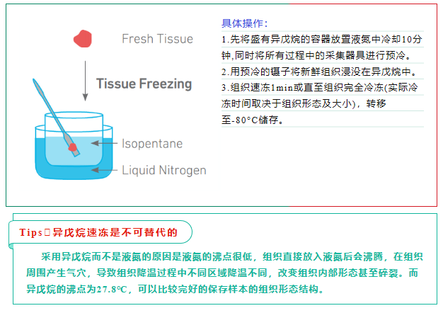 將組織進行凍存的目的是為了得到保護RNA的質量及組織形態(tài)的完整,從而真實的反映出細胞和基因在空間中的分布情況。因此,拿到新鮮組織后,需要對組織樣本進行異戊烷速凍。