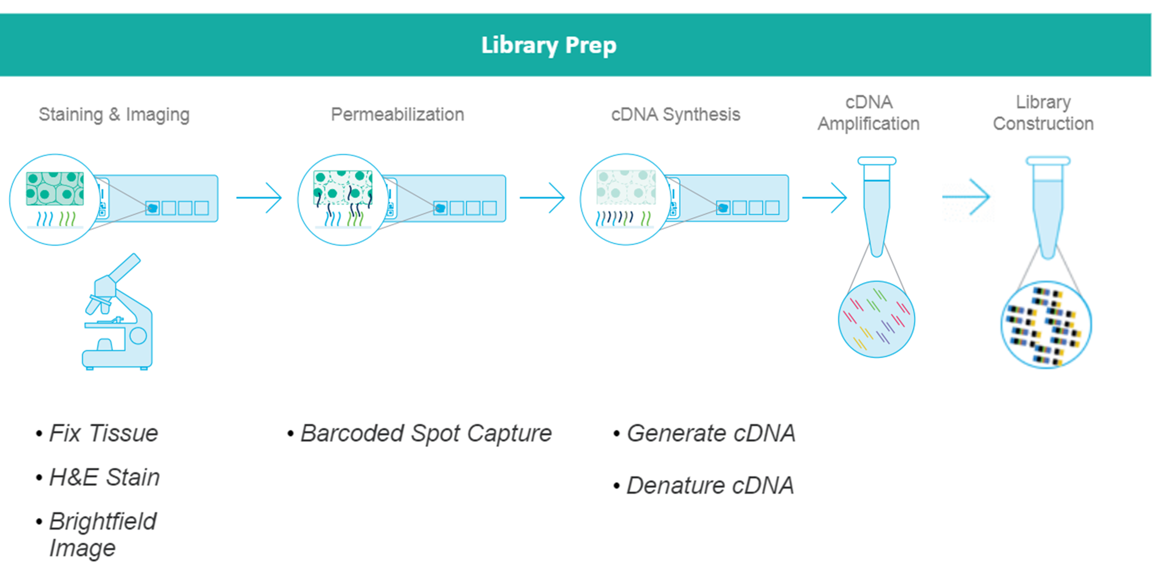 將組織切片貼合在帶有mRNA結合捕獲探針的載玻片上,通過甲醛固定、H&E染色并拍照得到組織切片的形態(tài)結構。再進行透化處理,使細胞中的mRNA釋放,并結合到芯片相鄰的捕獲探針上。將捕獲的mRNA反轉錄合成cDNA并構建測序文庫進行上機測序,從而獲取基因表達信息。