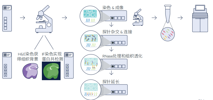 沿襲冰凍組織空間轉錄組實驗,Visium FFPE測序也需要對組織進行切片,因此客戶提供樣本時,可以是前期保存的石蠟組織塊,或取新鮮組織用石蠟包埋。后續(xù)切片、質控、RNA信息捕獲及文庫構建和生信數據分析等工作,全部由烈冰完成,具體實驗流程如下:
