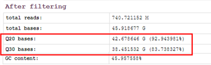序列質(zhì)量主要通過測序質(zhì)量值Q20/Q30的占比來表征,即堿基測序結(jié)果的錯誤率在1% / 0.1%以下的比例。理想的測序結(jié)果reads的堿基質(zhì)量均高于30。