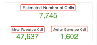 b) Median Genes per Cell:每個細(xì)胞的基因中位數(shù)取決于樣本的細(xì)胞類型,例如在成熟B、T、粒細(xì)胞數(shù)量較多的組織中,由于這些類型細(xì)胞表達的基因數(shù)普遍較少,導(dǎo)致基因中位數(shù)較低。而像腫瘤組織、或者體外培養(yǎng)的干細(xì)胞/類器官組織,它們的基因表達數(shù)較高,甚至可以超過1W,這就導(dǎo)致該類樣本基因中位數(shù)非常高。因此,我們確認(rèn)細(xì)胞數(shù)量以及基因中位數(shù)時,需考慮實際組織的細(xì)胞類型組成情況。