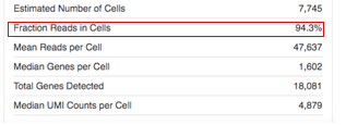 c) Fraction Reads in Cells:每個樣本過濾后細(xì)胞的reads數(shù)占總reads數(shù)(含背景)的百分比,反映的是測序數(shù)據(jù)的利用率。該參數(shù)的理想值應(yīng)達到80%以上。
