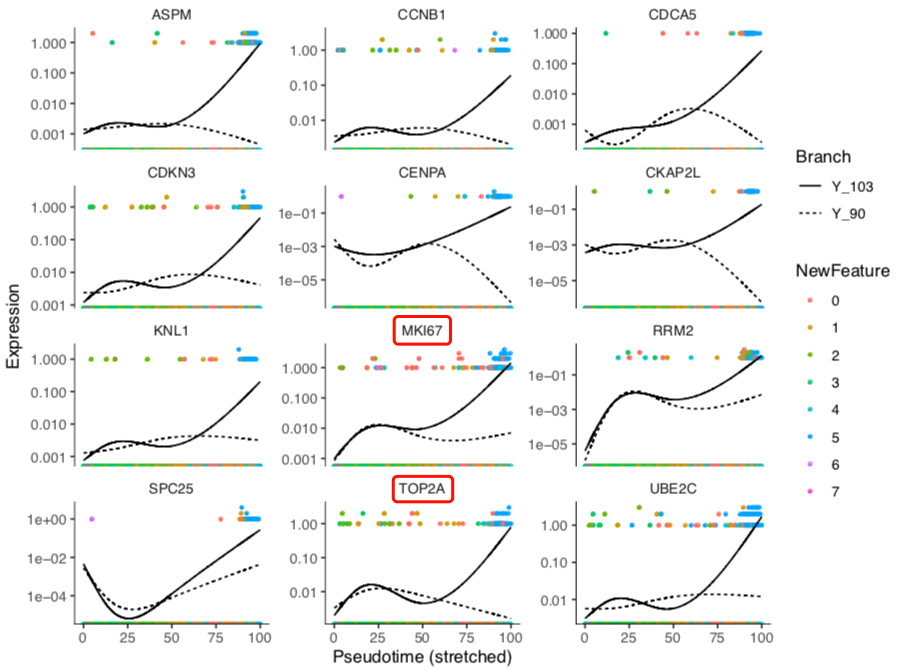 確定了分化起點(diǎn)后,Monocle可以模擬出每個(gè)細(xì)胞所處的分化時(shí)間,并尋找隨著分化時(shí)間逐漸升高或降低的基因表達(dá)熱圖和分布圖,即Beam分析。圖4將Top200差異基因聚成4類,展示了pre-branch向cell fate1和cell fate2狀態(tài)分化相關(guān)的命運(yùn)決定基因。圖5展示了與細(xì)胞增殖相關(guān)的基因,如MKI67和TOP2A在cluster 5中高表達(dá),提示cluster 5作為CD8+ Na?ve T細(xì)胞終末分化狀態(tài)是一種增殖型細(xì)胞(Proliferating)。除此之外,如果有特別關(guān)注的基因也可以基于關(guān)注的基因進(jìn)行繪制。