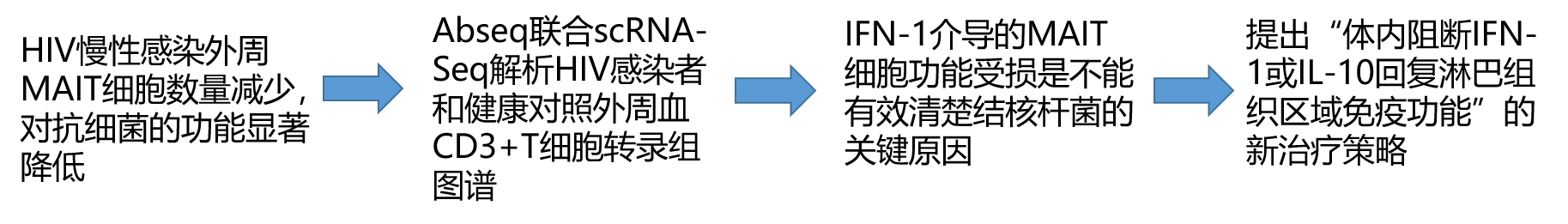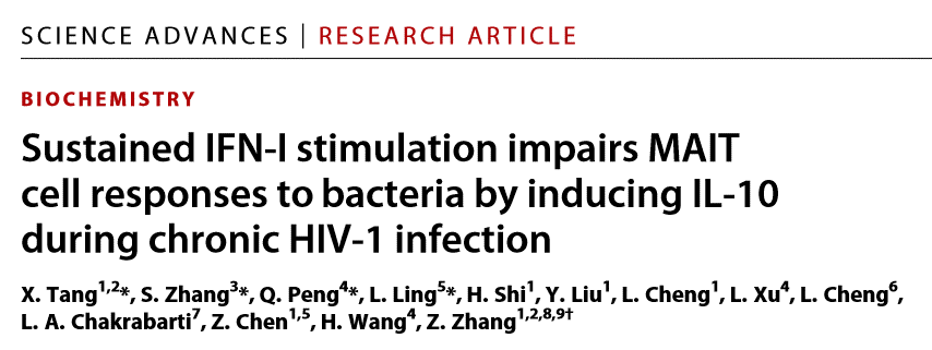 2020年2月19日,南方科技大學(xué)第二附屬醫(yī)院/深圳市第三人民醫(yī)院張政團(tuán)隊(duì)在Science Advances發(fā)表題為:Sustained IFN-I Stimulation Impairs MAIT Cell Responses to Bacteria by Inducing IL-10 during chronic HIV-1 Infection的研究論文。該研究闡明了HIV感染中IFN-I的免疫致病新機(jī)理,為研發(fā)阻遏HIV感染者體內(nèi)MAIT細(xì)胞功能損傷、降低HIV感染者易感結(jié)核提供了新的策略和科學(xué)手段。
