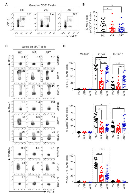 圖1來自HIV感染患者和健康對(duì)照的MAIT細(xì)胞對(duì)大腸桿菌或IL-12 / 18刺激的功能活性