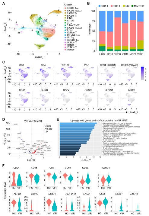 為了更加準(zhǔn)確地分析MAIT細(xì)胞,在C7中去除了γδT細(xì)胞后進(jìn)一步分析。在HIV+和健康對(duì)照之間篩選MAIT細(xì)胞中差異表達(dá)的基因和表面蛋白,共有72個(gè)顯著上調(diào),20個(gè)下調(diào)(P <0.01)。其中上調(diào)的蛋白質(zhì)和基因,包括激活的CD38,CD134和HLA-DRA,耗竭相關(guān)基因LAG3和TIGIT,和IFN刺激基因(ISG),包括CXCR3,STAT1和CCL5。相反,HIV-1感染患者的MAIT細(xì)胞中與T細(xì)胞功能相關(guān)的蛋白質(zhì)和基因,包括CD7,CD98,CD54,DUSP1,KLRB1和JUN均下調(diào)。GO富集分析進(jìn)一步表明,VIR患者的MAIT細(xì)胞中的上調(diào)基因富集在細(xì)胞激活途徑。因此,來自HIV-1感染患者的MAIT細(xì)胞表現(xiàn)出免疫激活的基因特征,與抑制性受體上調(diào)和ISG表達(dá)增加有關(guān)。