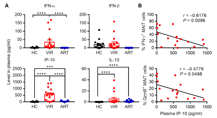ScRNAseq和Abseq結(jié)果表明,HIV+患者M(jìn)AIT細(xì)胞中ISG的上調(diào)導(dǎo)致IFN-I信號(hào)增加可能在MAIT細(xì)胞功能障礙中發(fā)揮作用。研究者進(jìn)一步評(píng)估了IFN-α和IFN-β以及IFN-γ誘導(dǎo)的蛋白IP-10和IL-10的表達(dá)水平,結(jié)果顯示,VIR患者血漿中的IFN-α和IP-10濃度明顯高于對(duì)照和ART治療患者。值得注意的是,VIR患者在響應(yīng)大腸桿菌刺激后,IP-10血漿水平與MAIT細(xì)胞產(chǎn)生的IFN-γ或GzmB呈負(fù)相關(guān)。這些結(jié)果表明,IFN-I信號(hào)傳導(dǎo)可能與HIV-1感染期間MAIT細(xì)胞功能受損有關(guān)。