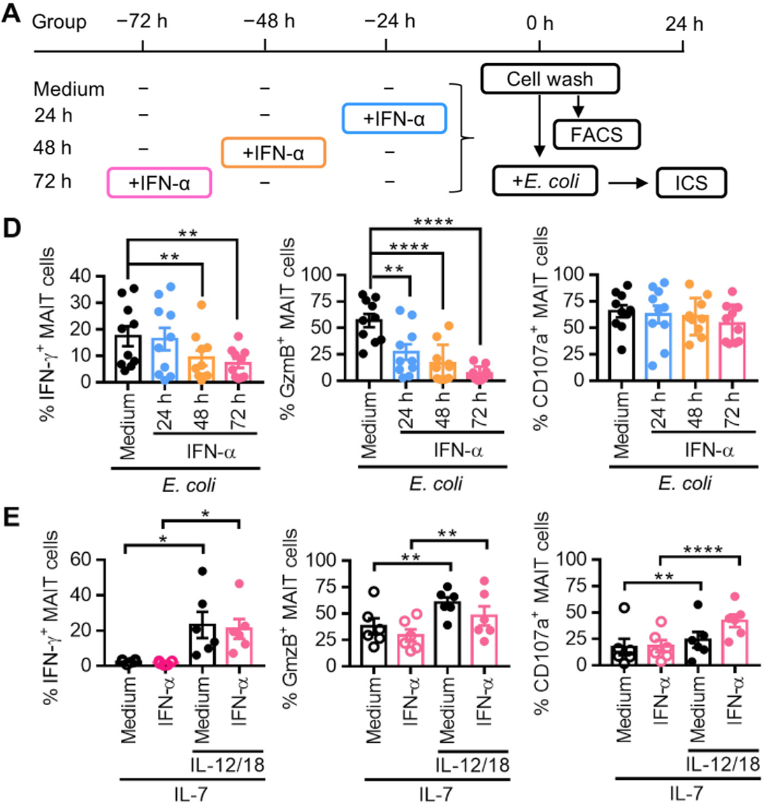 研究者通過用IFN-α分別處理24、48或72小時(shí),探究IFN-α是否影響MAIT細(xì)胞對(duì)大腸桿菌以及IL-12 / 18刺激的反應(yīng)。發(fā)現(xiàn)持續(xù)的IFN-α處理抑制了MAIT細(xì)胞對(duì)大腸桿菌的反應(yīng),而對(duì)細(xì)胞因子的刺激無抑制作用。(圖4)