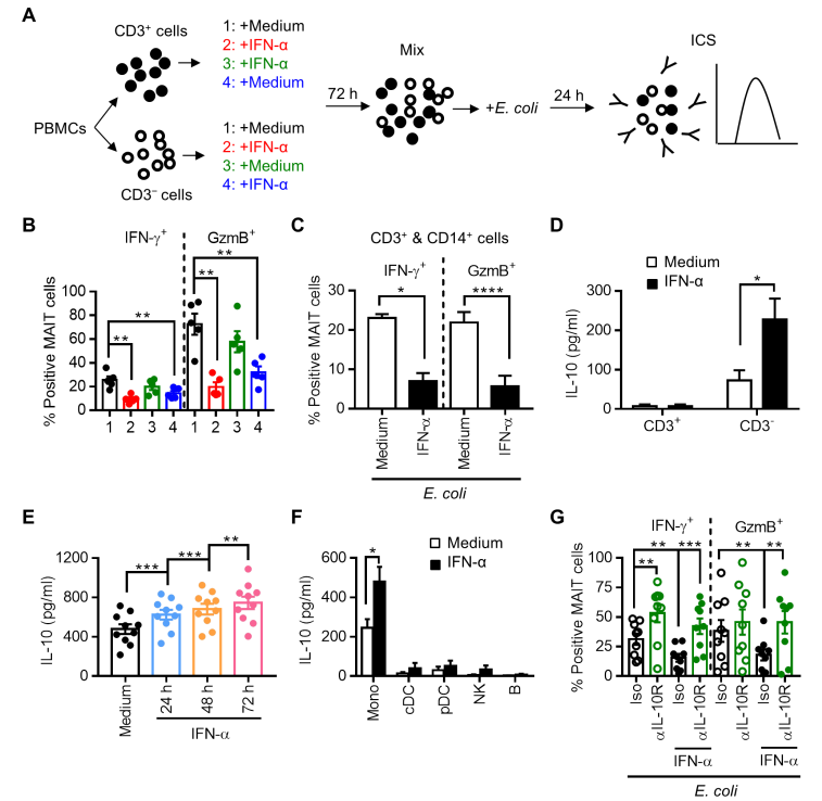 為了研究IFN-α如何削弱MAIT細(xì)胞對(duì)大腸桿菌的反應(yīng),研究者通過篩選一系列細(xì)胞進(jìn)行大腸桿菌刺激實(shí)驗(yàn),結(jié)果發(fā)現(xiàn)單核細(xì)胞是自發(fā)和IFN-α誘導(dǎo)的IL-10的主要來源,持續(xù)的IFN-α刺激主要通過單核細(xì)胞產(chǎn)生的IL-10抑制MAIT細(xì)胞的功能。(圖5)