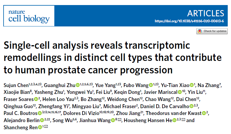 2021 年 1 月,上海長(zhǎng)海醫(yī)院任善成教授與加拿大多倫多大學(xué) Housheng Hansen He 教授、復(fù)旦大學(xué)附屬腫瘤醫(yī)院王建華教授合作在 Nature Cell Biology 雜志發(fā)表了題為「Single-cell analysis reveals transcriptomic remodellings in distinct cell types that contribute to human prostate cancer progression」論文。