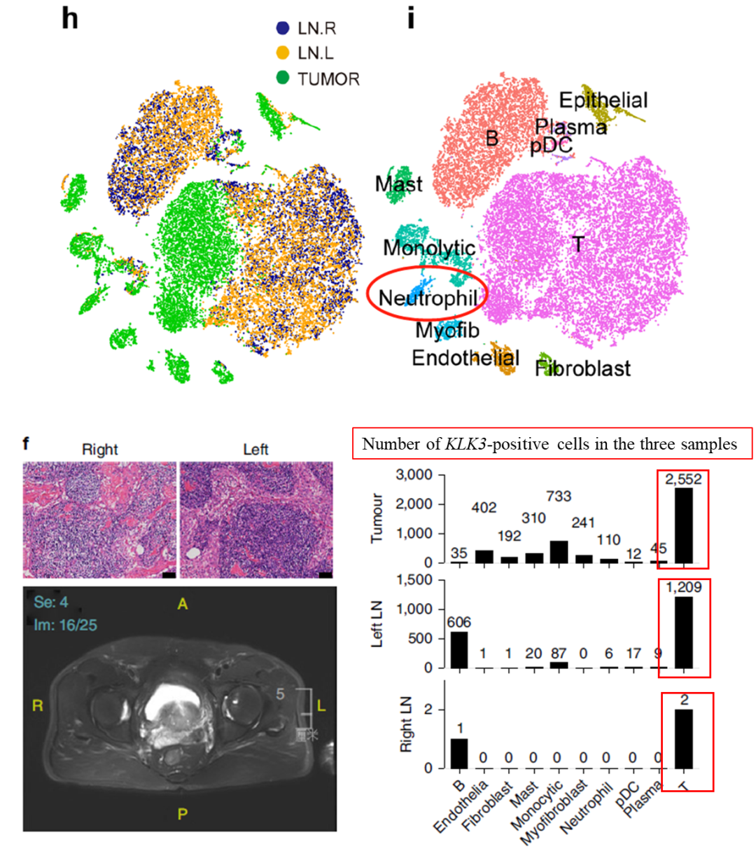 有趣的是,其中一例前列腺癌患者的 MRI 影像及術(shù)后病理均提示左右兩側(cè)髂外淋巴結(jié)為陰性,而 scRNA-Seq 細(xì)胞亞群統(tǒng)計(jì)顯示右側(cè)淋巴結(jié)組織中存在高表達(dá) KLK3 的 T 細(xì)胞,提示這可能已經(jīng)形成了「轉(zhuǎn)移前癌巢」結(jié)構(gòu);而左側(cè)淋巴結(jié)組織中不僅存在高表達(dá) KLK3 的 T 細(xì)胞,還存在惡性上皮細(xì)胞,即左側(cè)淋巴結(jié)已發(fā)生了臨床無法識(shí)別的微轉(zhuǎn)移灶。
