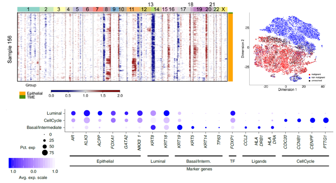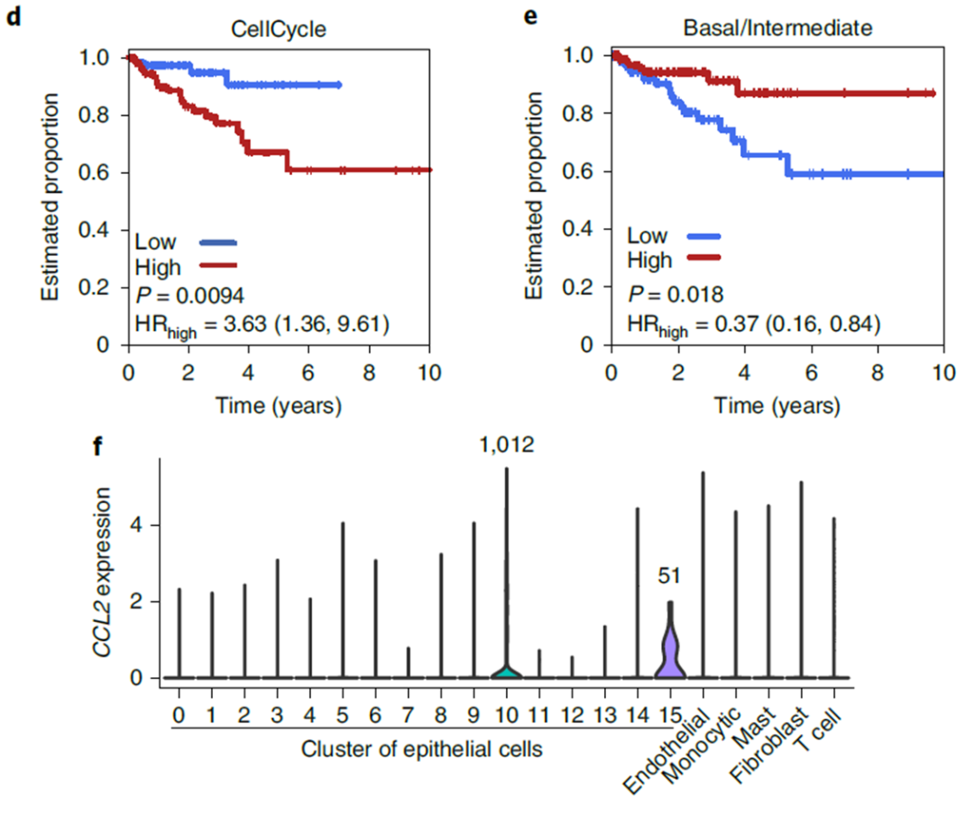 通過拷貝數(shù)變異分析、腫瘤細(xì)胞的 marker 基因/信號(hào)通路相關(guān)性分析,將上皮細(xì)胞鑒定為 luminal types、cell-cycle 、basal/intermediate 類型;我們主要研究了這些細(xì)胞類型與臨床預(yù)后的關(guān)系,發(fā)現(xiàn)特異性表達(dá)細(xì)胞因子 CCL2 的 basal/int. 亞群與前列腺癌有較好的預(yù)后關(guān)系;而 cell-cycle 細(xì)胞亞群則與前列腺癌預(yù)后呈負(fù)相關(guān)。