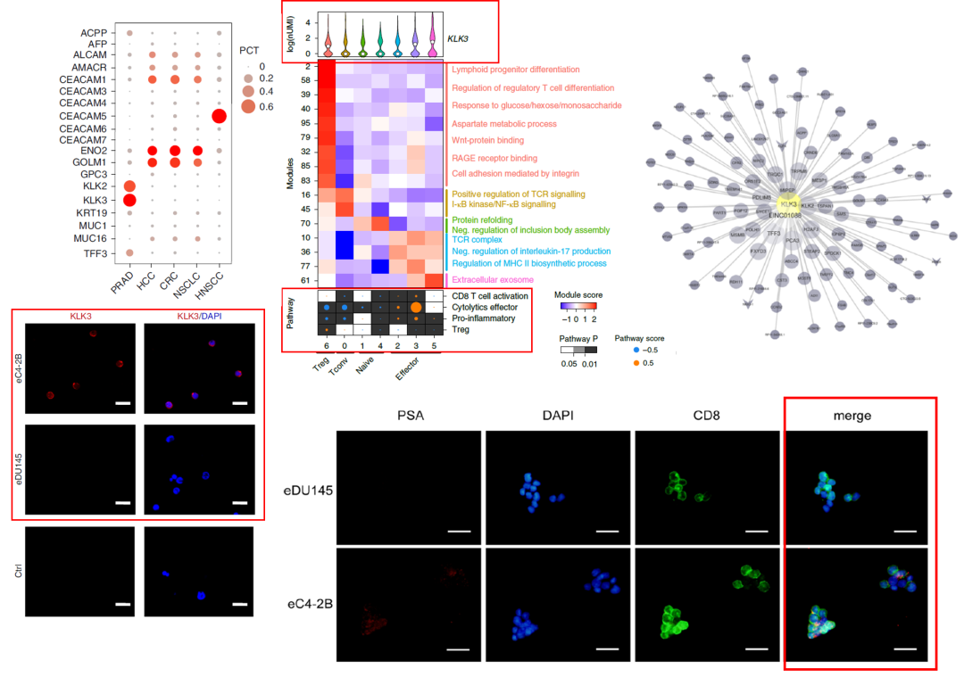 在 T 細(xì)胞的研究中,我們驚奇的發(fā)現(xiàn),T 細(xì)胞竟然表達(dá)前列腺癌特異性基因 KLK3,深入挖掘分析多種類型的單細(xì)胞公共數(shù)據(jù)庫發(fā)現(xiàn) T 細(xì)胞均表達(dá)相應(yīng)的腫瘤標(biāo)記基因的廣泛特征。