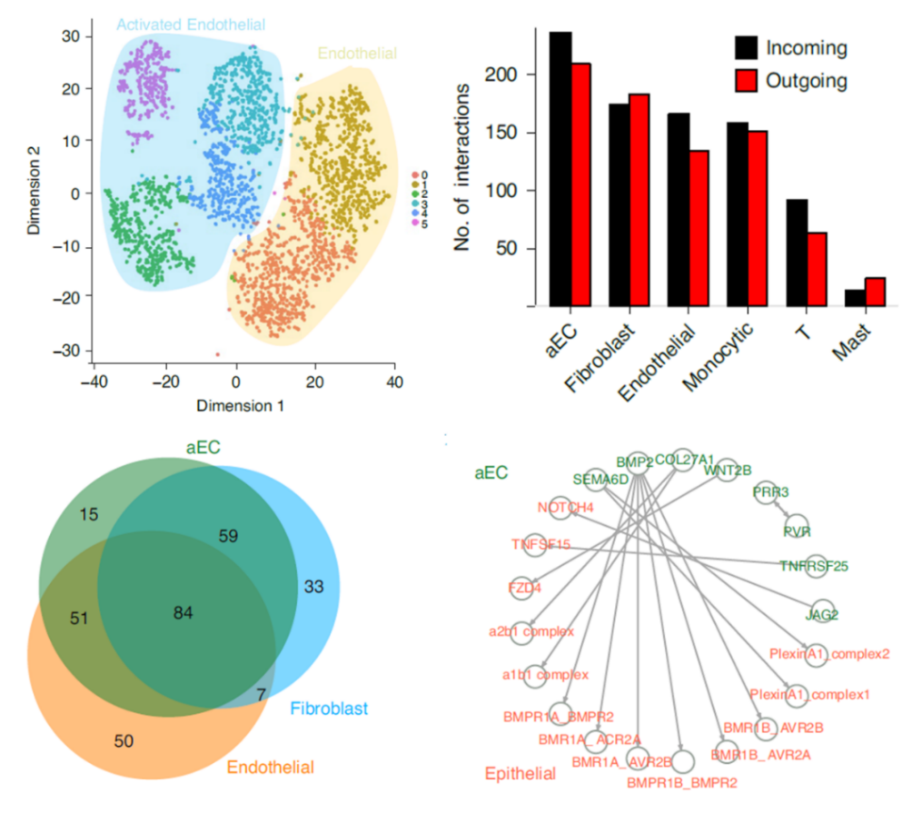 我們從 signature 基因、pathway 和轉(zhuǎn)錄因子等多角度完整描述了基質(zhì)細(xì)胞的高度異質(zhì)性,并在內(nèi)皮細(xì)胞(EC)中發(fā)現(xiàn)有一部分高表達(dá)腫瘤相關(guān)性成纖維細(xì)胞(CAF)的相關(guān)特征基因,將其命名為激活的內(nèi)皮細(xì)胞(aECs)。通過細(xì)胞通訊分析,發(fā)現(xiàn) aEC 與上皮細(xì)胞有強(qiáng)作用關(guān)系,提示其可能影響腫瘤的進(jìn)展。