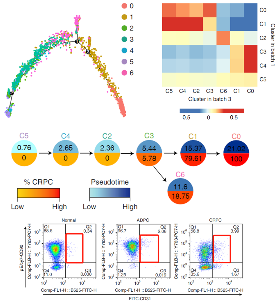于是,重新設(shè)計(jì) 11 例不同時(shí)期前列腺癌樣本(Batch3),分選出內(nèi)皮細(xì)胞進(jìn)行單細(xì)胞測(cè)序,通過擬時(shí)序分析發(fā)現(xiàn) aEC 細(xì)胞大部分均來源于 CRPC 樣本,其亞群占比隨腫瘤進(jìn)展至 CRPC 而逐步升高,表明 aEC 細(xì)胞亞群與前列腺癌惡性進(jìn)展為 CRPC 密切相關(guān)。