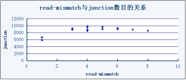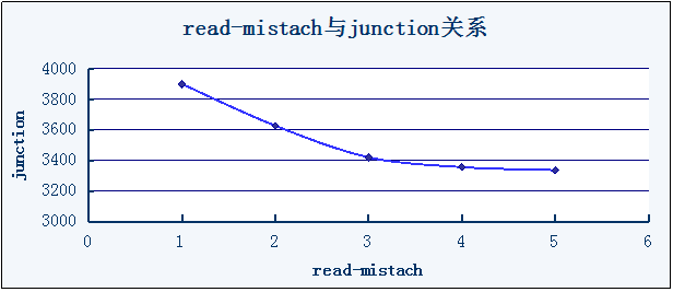 通過(guò)測(cè)試數(shù)據(jù)可以知道對(duì)于Illumina測(cè)序平臺(tái)數(shù)據(jù)而言,read-mismatch數(shù)字升高與junction數(shù)目基本成反比關(guān)系,隨著read-mismatch數(shù)目變長(zhǎng),junction數(shù)目急速降低。