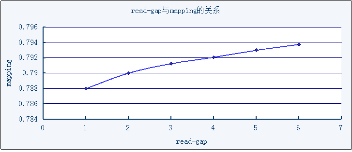 通過(guò)測(cè)試數(shù)據(jù)可以知道對(duì)于Illumina測(cè)序平臺(tái)數(shù)據(jù)而言,read-gap數(shù)字升高與mapping率基本成正比關(guān)系,隨著read-mismatch數(shù)目變長(zhǎng),mapping率上升。整體上升大約1.2%。