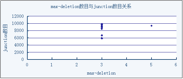 通過(guò)測(cè)試數(shù)據(jù)可以知道對(duì)于ionproton測(cè)序平臺(tái)數(shù)據(jù)而言,針對(duì)同一max-deletion長(zhǎng)度而言,長(zhǎng)度3和長(zhǎng)度5的情況下junction數(shù)目可以一致,所以認(rèn)為max-deletion對(duì)junction數(shù)目影響不明顯。