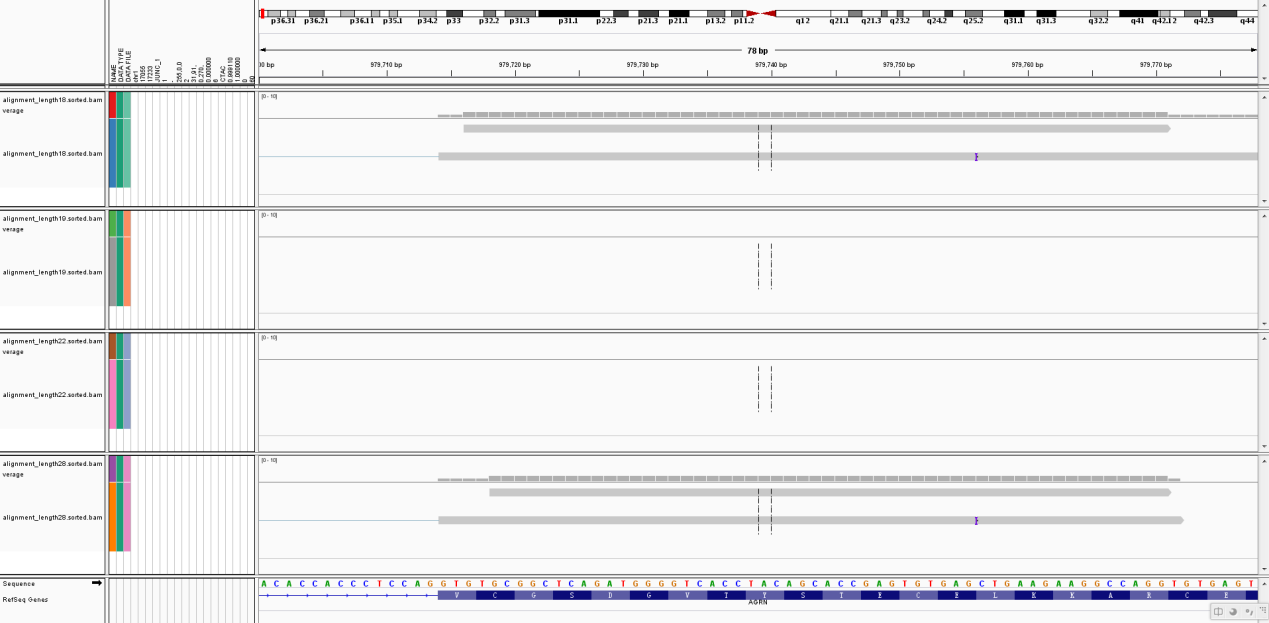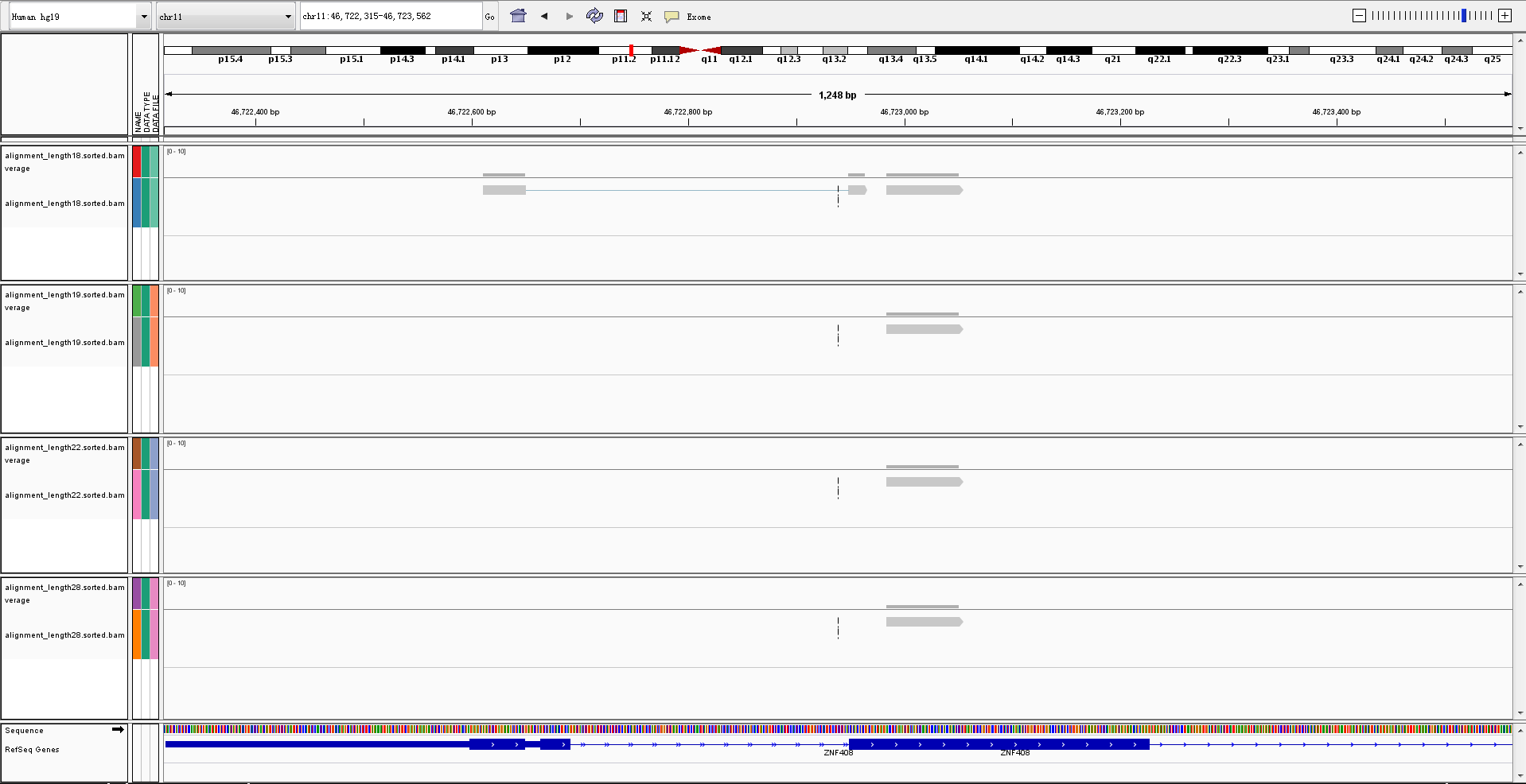 上圖中可以看出,在參考基因中,這個部分是有junction的,而在segment_length為19,22,28的時候,都沒有找到回帖上,我們認為這個結(jié)果對于文獻中提到的segment_length越短,敏感性越強這個說法。