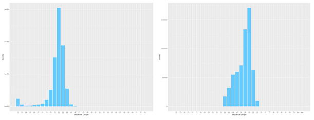 注:左圖為miRNA長(zhǎng)度分布圖;右圖為piRNA長(zhǎng)度分布圖。