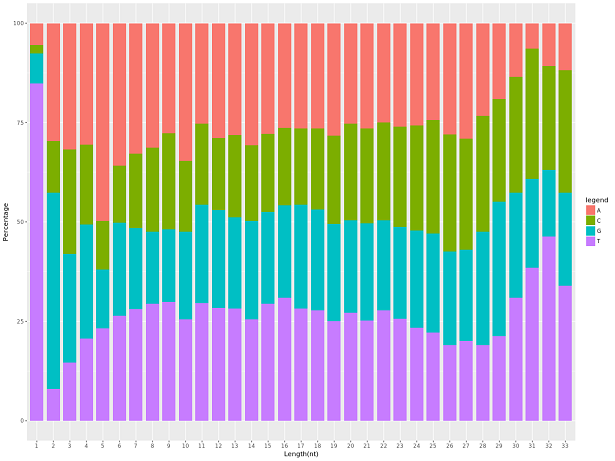 注:橫坐標(biāo)表示序列長(zhǎng)度,縱坐標(biāo)表示百分比,不同顏色表示不同的核苷酸。