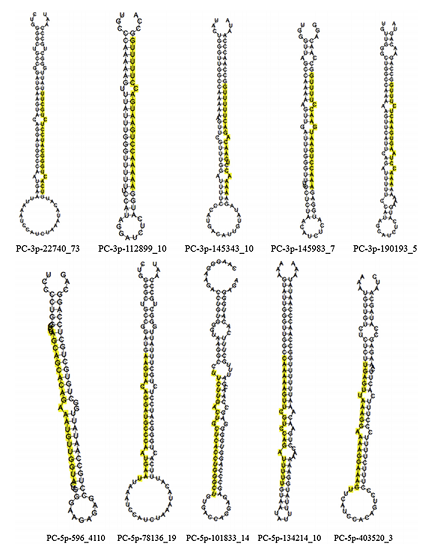注:該圖展示了進(jìn)一步分析與已知miRNA不匹配的測(cè)序reads預(yù)測(cè)的新的miRNA,這10個(gè)序列都具有顯著的莖-環(huán)發(fā)夾二級(jí)結(jié)構(gòu)。
