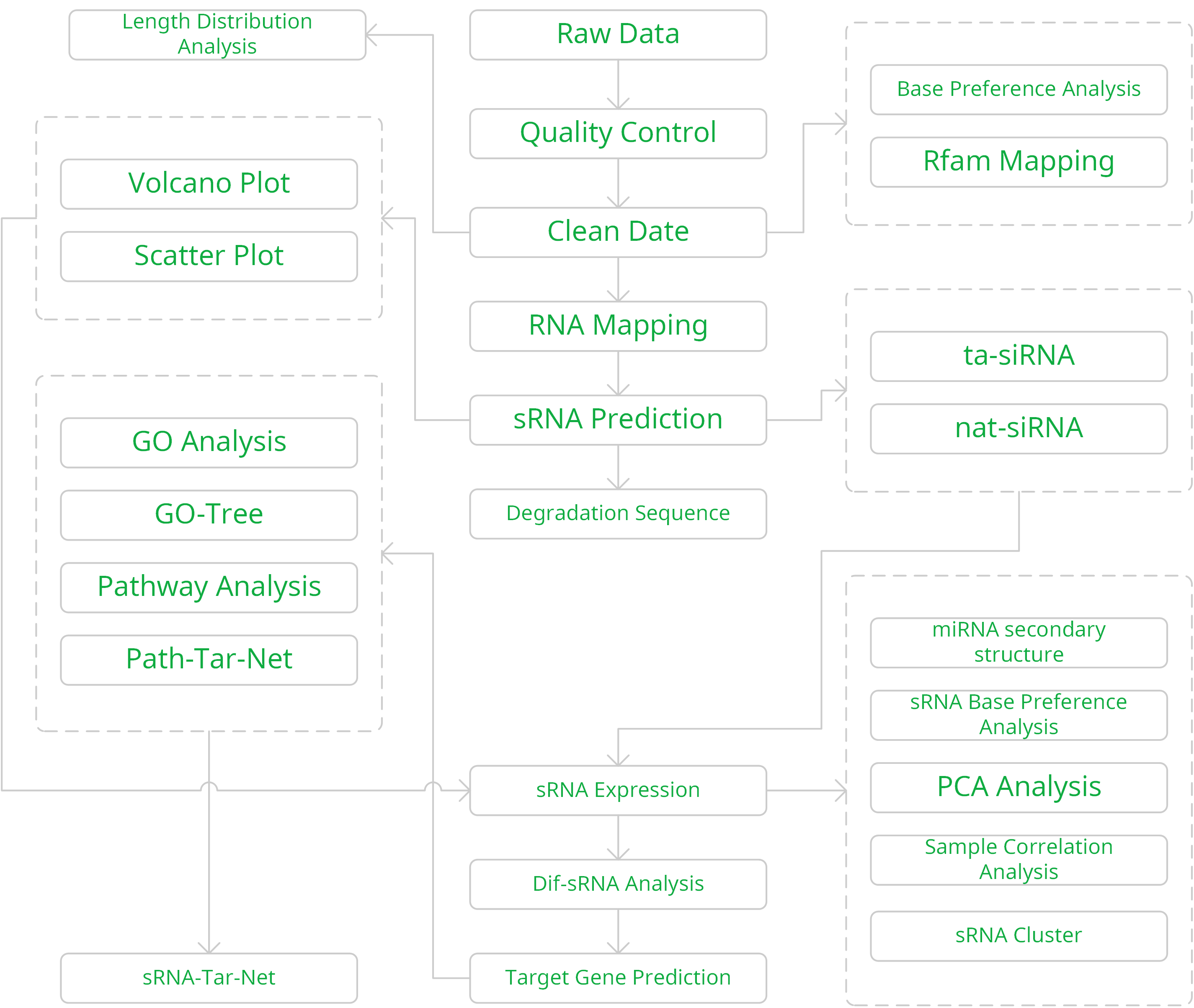Small RNA主要包括miRNA、piRNA、tsRNA(tRF&tiRNA)、snRNA和snoRNA等,是一類(lèi)不具有蛋白編碼能力的RNA分子,能調(diào)控基因表達(dá),在細(xì)胞生長(zhǎng)、發(fā)育和代謝等基礎(chǔ)生物學(xué)過(guò)程中都扮演著重要的角色,甚至在癌癥等相關(guān)疾病形成過(guò)程中也起著關(guān)鍵的作用。高通量測(cè)序技術(shù)省去了煩瑣的Small RNA克隆文庫(kù)構(gòu)建過(guò)程,可以一次性生成上百萬(wàn)條Small RNA序列,能夠快速鑒定特定條件下表達(dá)的已知Small RNA并發(fā)現(xiàn)新的Small RNA,同時(shí)還可以研究不同條件下Small RNA的表達(dá)差異,并可以聯(lián)合轉(zhuǎn)錄組測(cè)序表達(dá)譜數(shù)據(jù)進(jìn)行關(guān)聯(lián)分析。