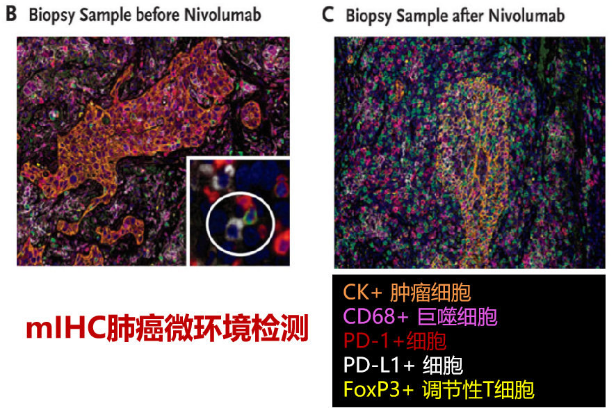 多色熒光免疫組化(mIHC)是基于酪胺信號(hào)放大( Tyramide Signal Amplification,TSA)技術(shù),利用抗原抗體反應(yīng)對(duì)樣本中多種標(biāo)志物(可實(shí)現(xiàn)一張切片同時(shí)標(biāo)記6種蛋白分子)進(jìn)行同時(shí)染色標(biāo)記,實(shí)現(xiàn)在同一組織切片樣本上對(duì)多個(gè)靶標(biāo)進(jìn)行區(qū)別標(biāo)記,進(jìn)而分析組織微環(huán)境中蘊(yùn)含的復(fù)雜信息。并研究它們之間的共定位、表達(dá)量和距離關(guān)系。