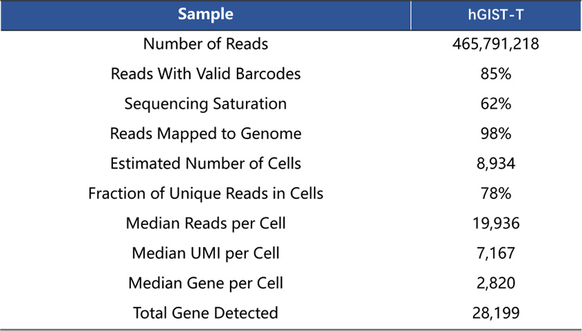 基于對人和小鼠多組織測試的數(shù)據(jù)結(jié)果,Novel Drop Navigator在細胞捕獲能力、捕獲Reads數(shù)、捕獲基因數(shù)、中位數(shù)基因、中位數(shù)UMI等關鍵參數(shù)的數(shù)據(jù)分析指標上均表現(xiàn)優(yōu)異;如對人的胃腸間質(zhì)腫瘤(GIST)樣本進行測試,捕獲細胞數(shù)8934個,中位數(shù)基因2820個,總檢測基因數(shù)28199個。