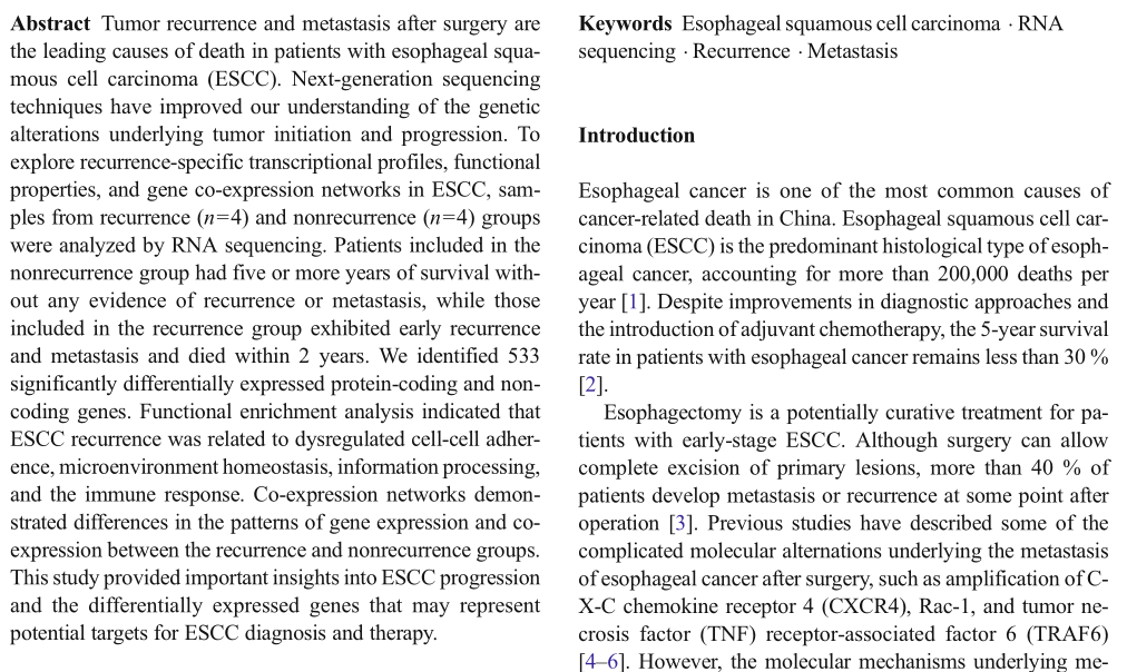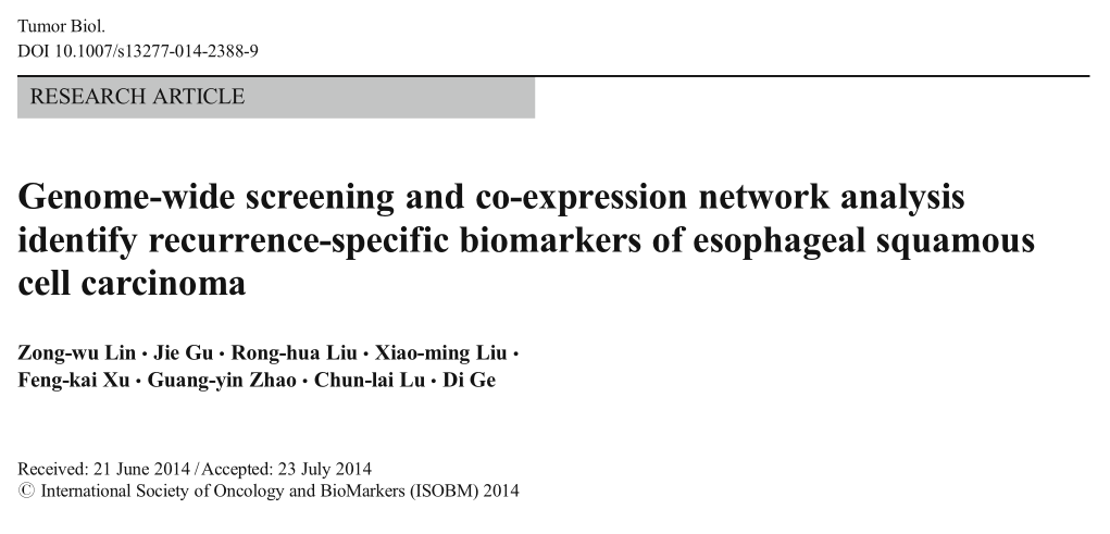 in Z, et al. Genome-wide screening and co-expression network analysis identify recurrence-specific biomarkers of esophageal squamous cell carcinoma. Tumor Biol.?2014 Nov;35(11):10959-68. (IF=2.84)