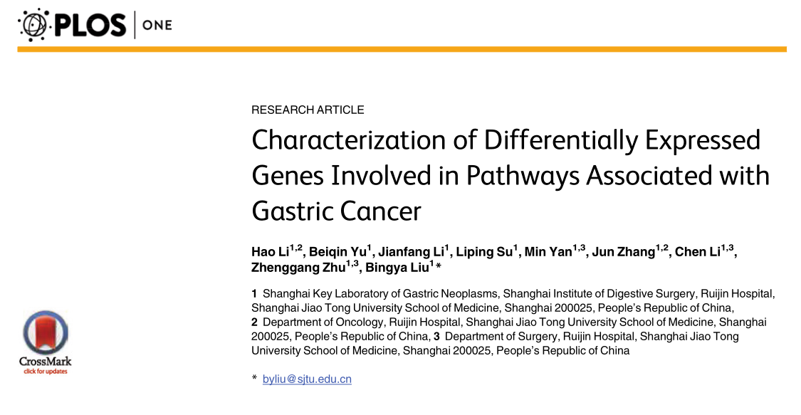 Li H, et al. Characterization of differentially expressed genes involved in pathways associated with gastric cancer. PLoS One. 2015 Apr 30;10(4):e0125013. (IF= 3.234)