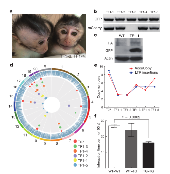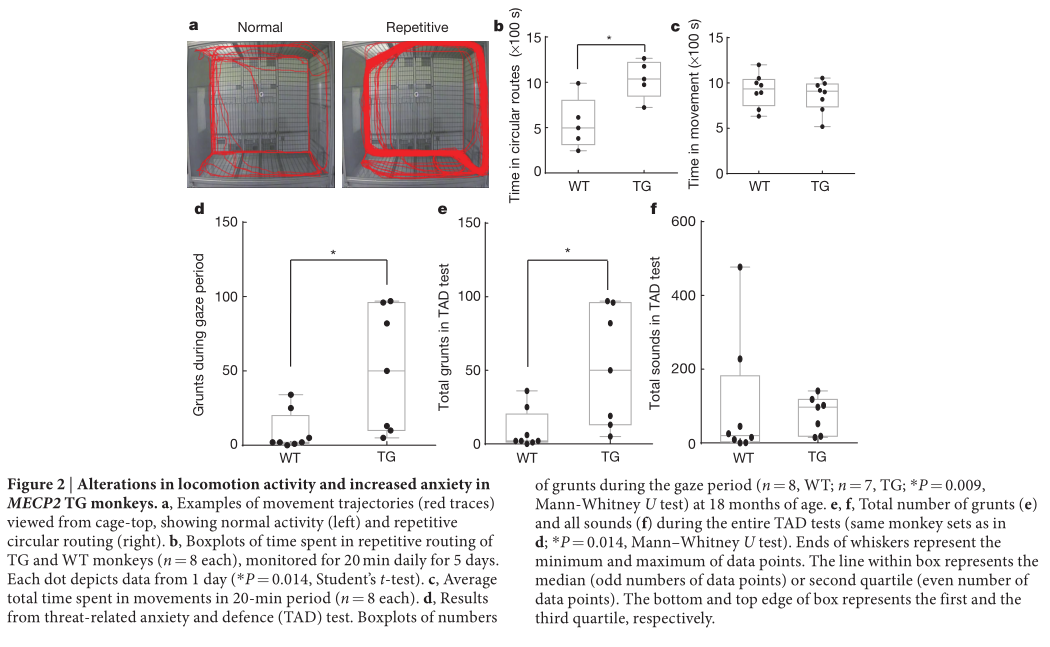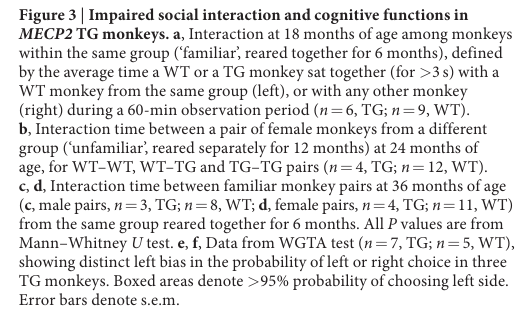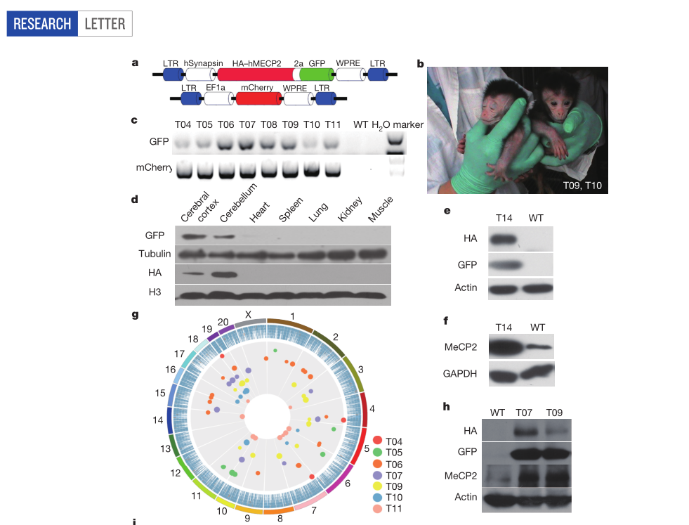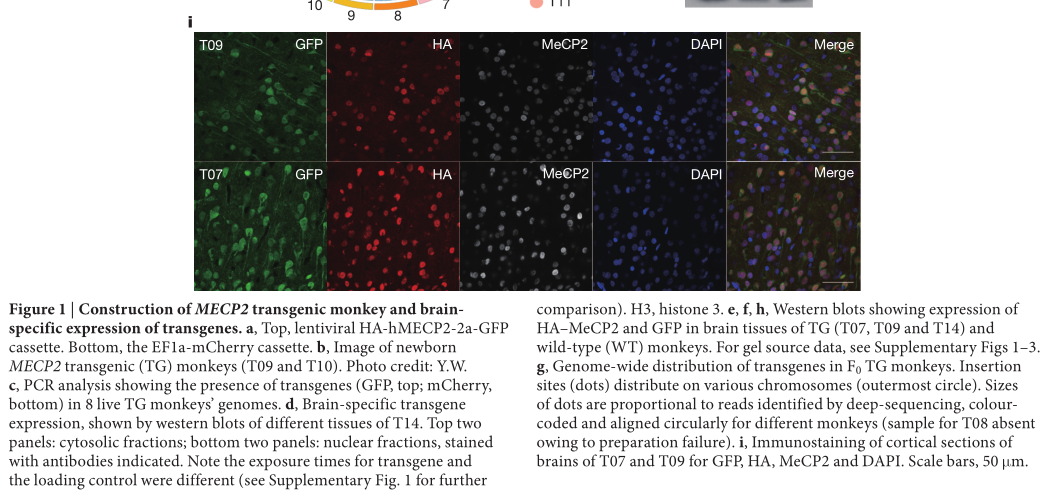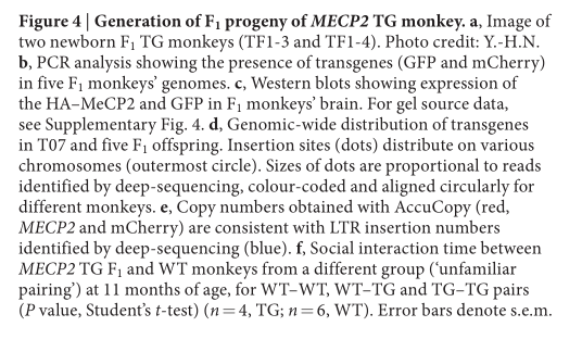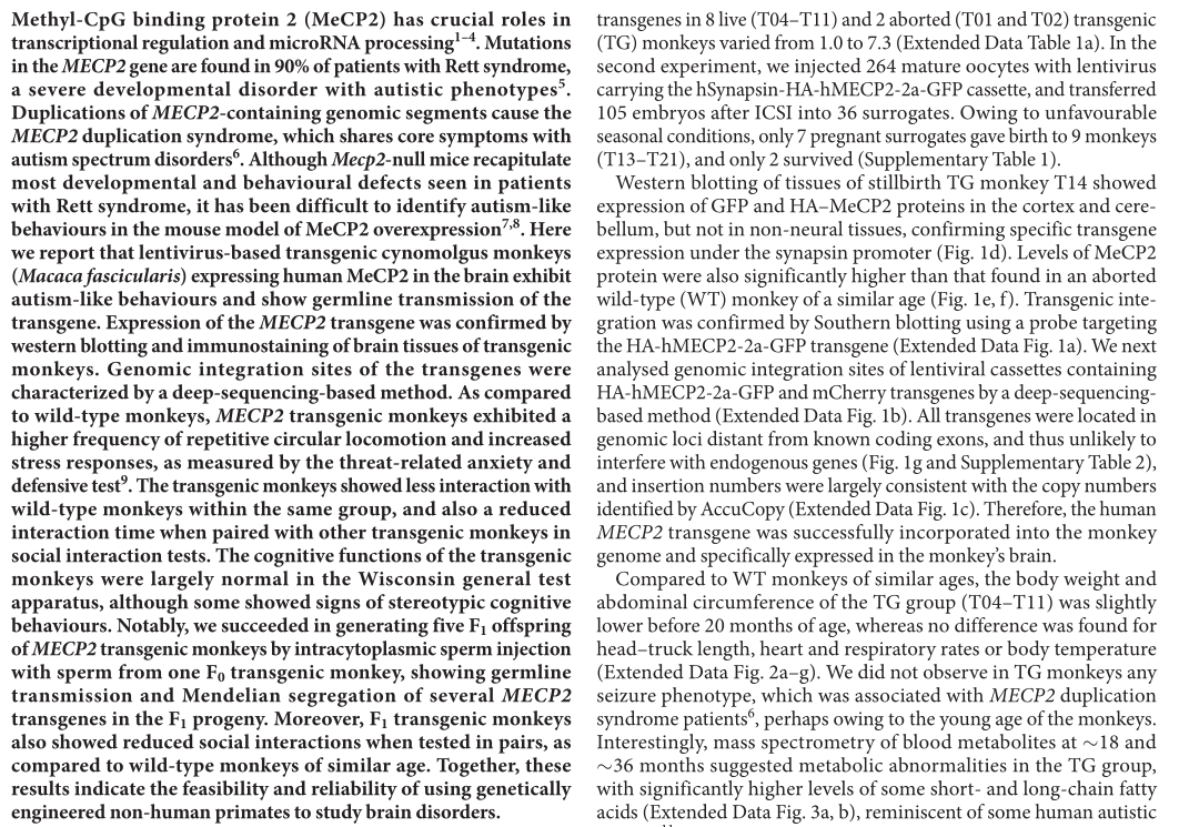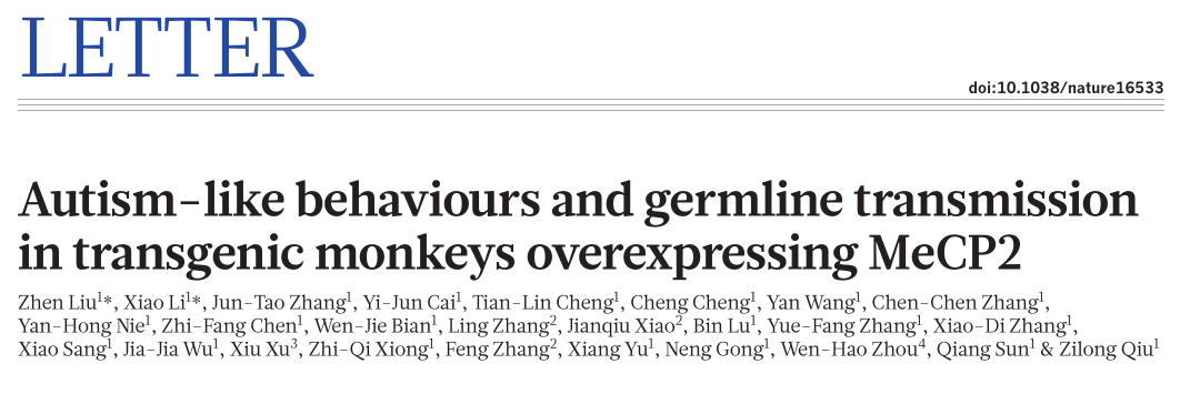 Liu Z,et al.Autism-like behaviours and germline transmission in transgenic monkeys overexpressing MeCP2. Nature. 2016 Feb 4;530(7588):98-102. (IF=41.456)