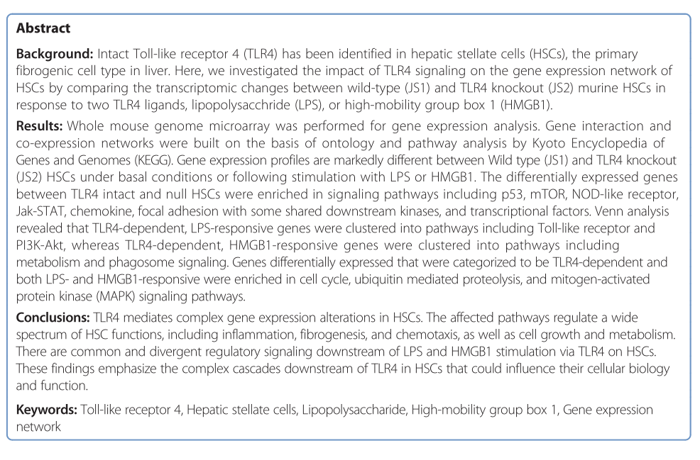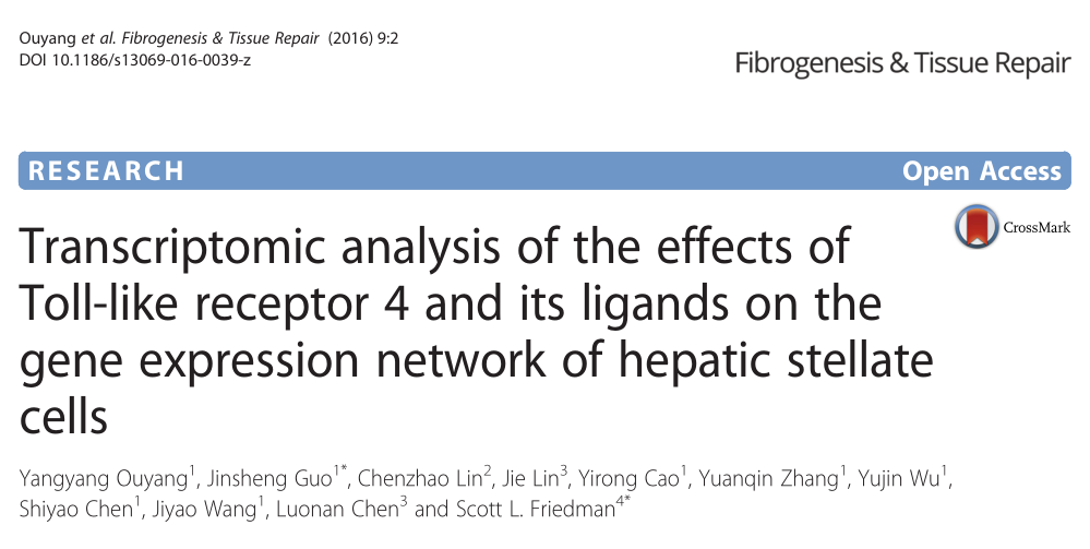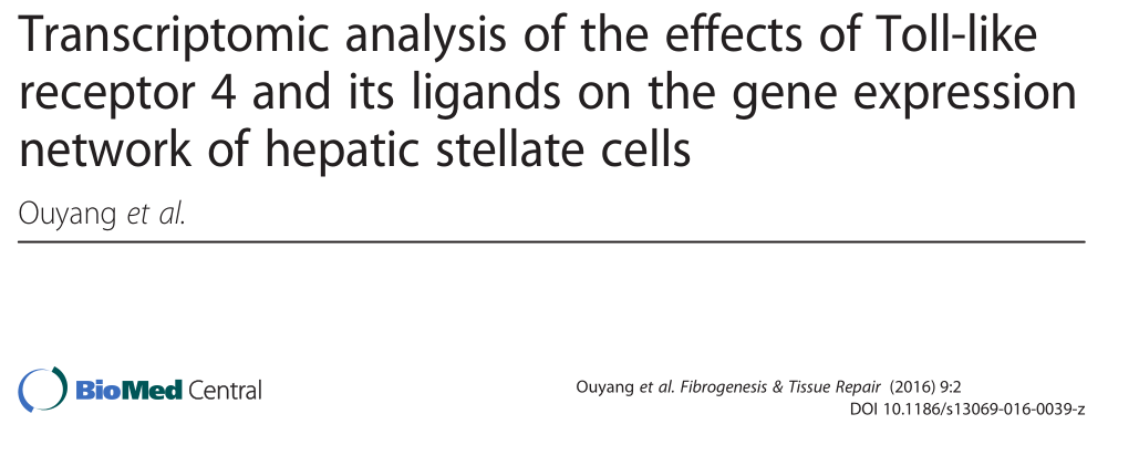 Ouyang, Y. et al. Transcriptomic analysis of the effects of Toll-like receptor 4 and its ligands on the gene expression network of hepatic stellate cells. Fibrogenesis Tissue Repair, 2016 Feb 18;9:2