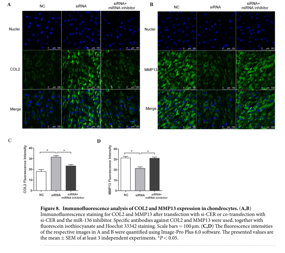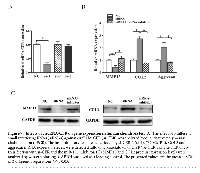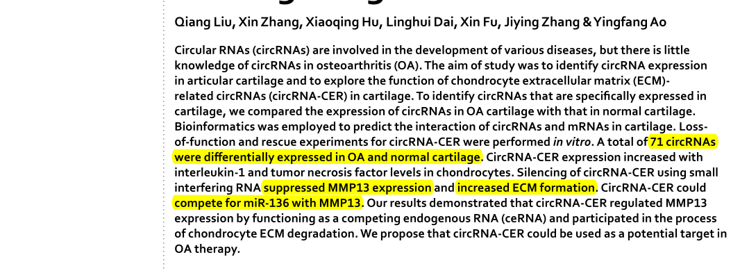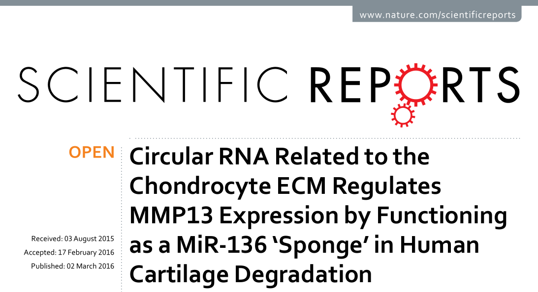 Liu Q, et al. Circular RNA Related to the Chondrocyte ECM Regulates MMP13 Expression by Functioning as a MiR-136 ‘Sponge’ in Human Cartilage Degradation. Sci Rep.?2016 Mar 2;6:22572. (IF=5.578)