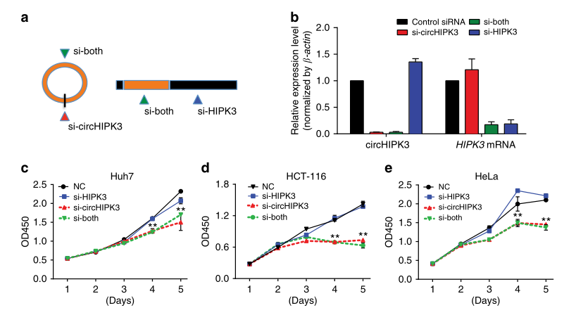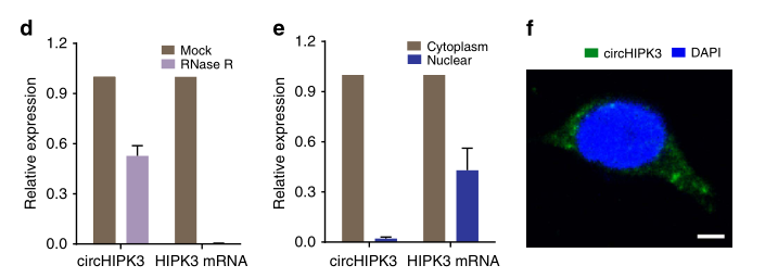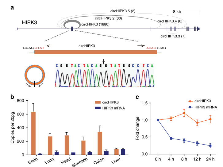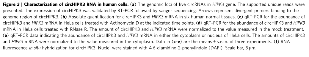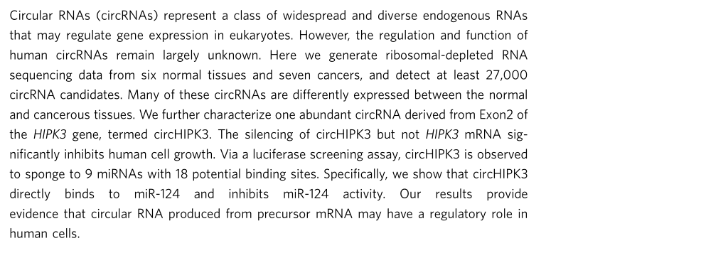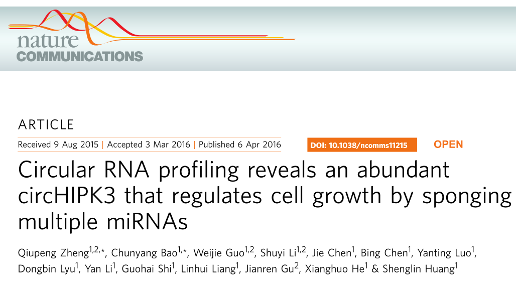 Zheng Q, et al. Circular RNA profiling reveals an abundant circHIPK3 that regulates cell growth by sponging multiple miRNAs. Nat Commun. 2016 Apr 6;7:11215. (IF=11.47)