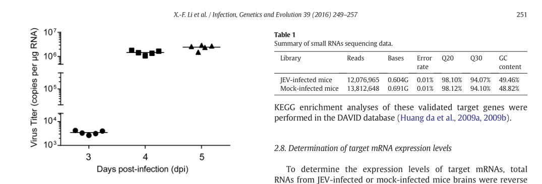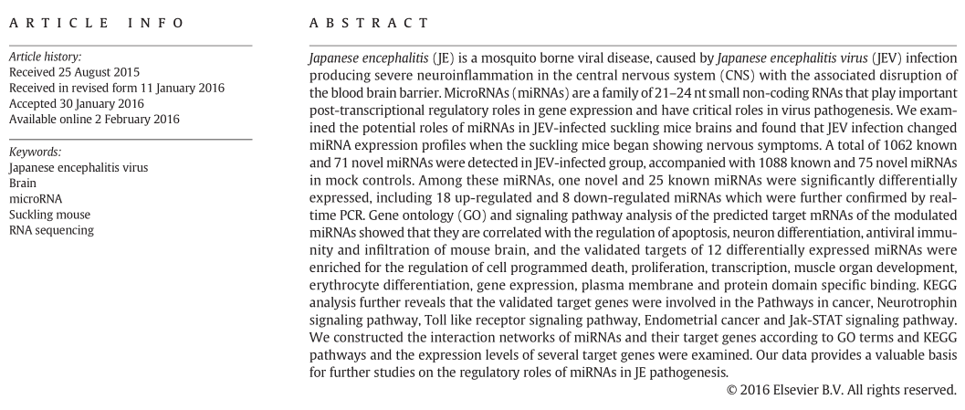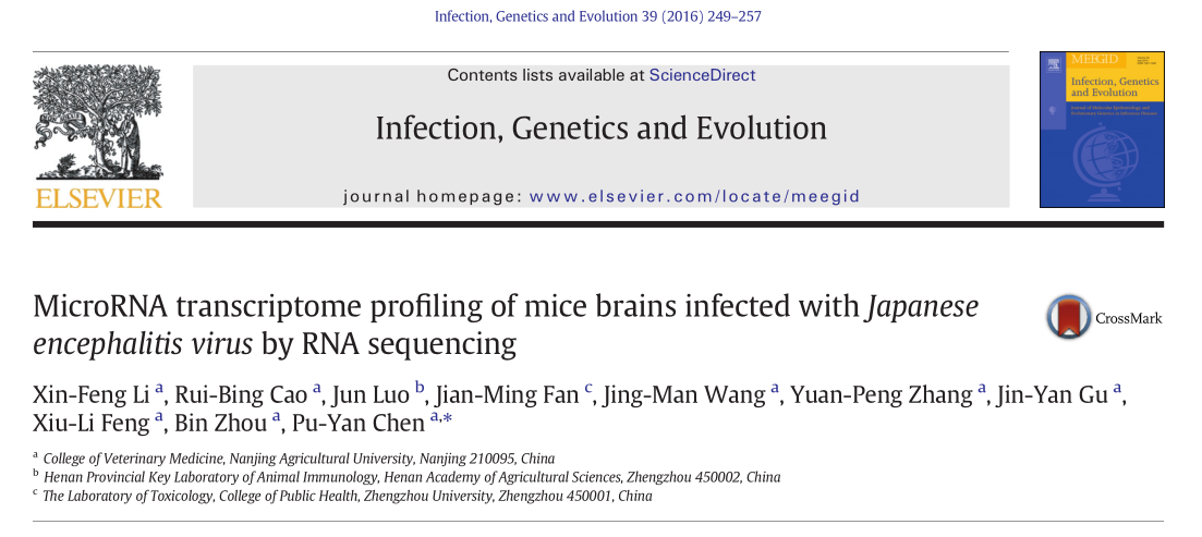 Li, X. F. et al. MicroRNA transcriptome profiling of mice brains infected with Japanese encephalitis virus by RNA sequencing. Infect Genet Evol. 2016 Apr;39:249-257.. (IF=2.885)