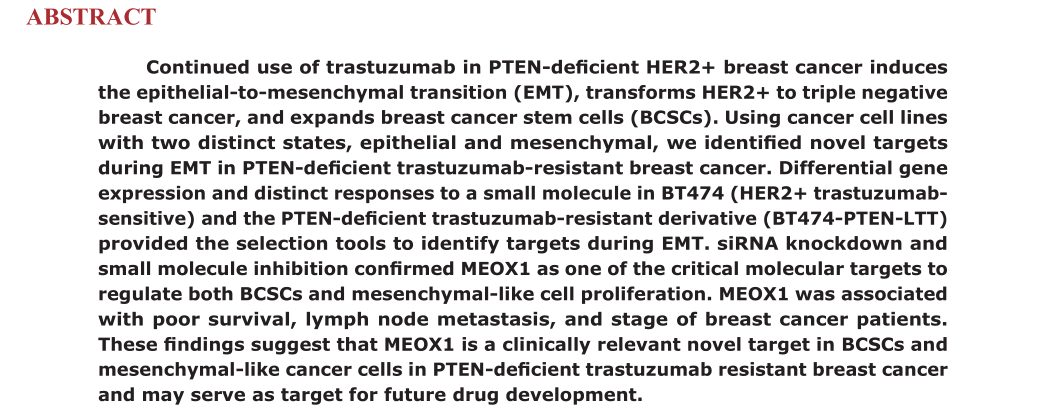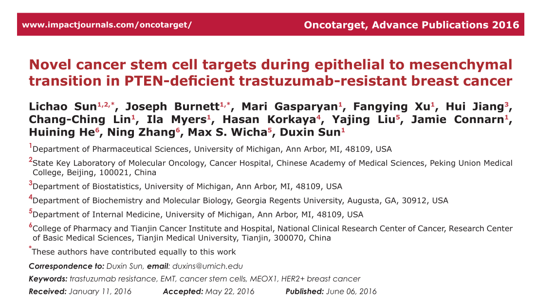 Sun L, et al. Novel cancer stem cell targets during epithelial to mesenchymal transition in PTEN-deficient trastuzumab-resistant breast cancer. Oncotarget.?2016 Aug 9;7(32):51408-51422. (IF=5.008)