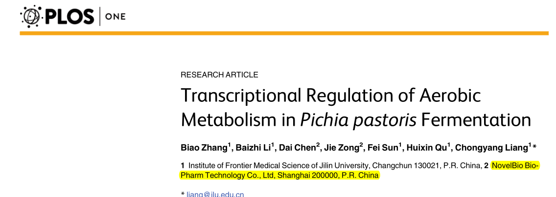 Zhang B, et al. Transcriptional Regulation of Aerobic Metabolism in Pichia pastoris Fermentation. PLoS One.?2016 Aug 18;11(8):e0161502. (IF=3.057)