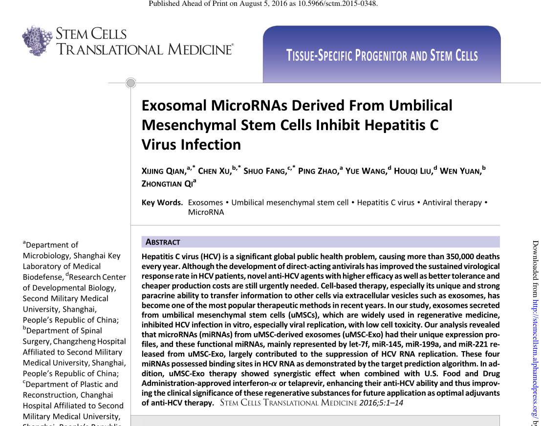 Qian X, et al. Exosomal?MicroRNAs?Derived?From Umbilical Mesenchymal Stem Cells Inhibit Hepatitis C Virus Infection. Stem Cells Transl Med.?2016 Sep;5(9):1190-203. (IF=4.247)