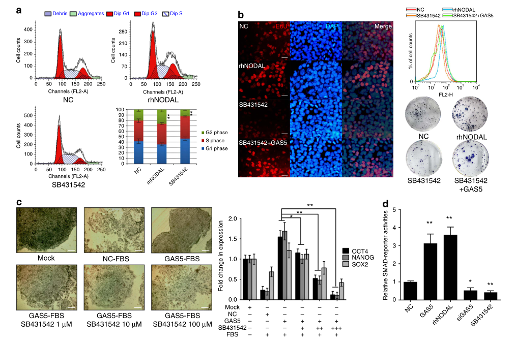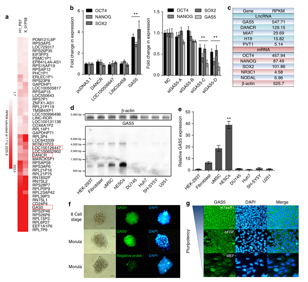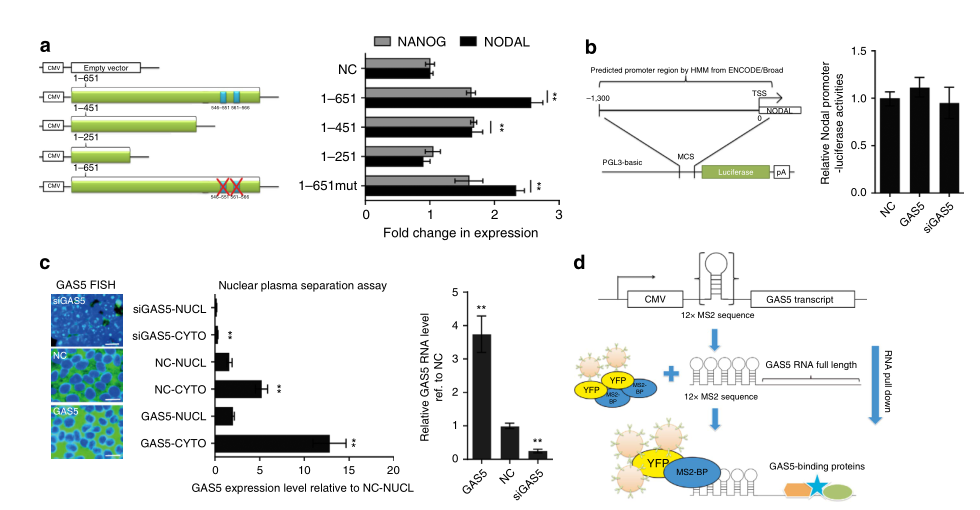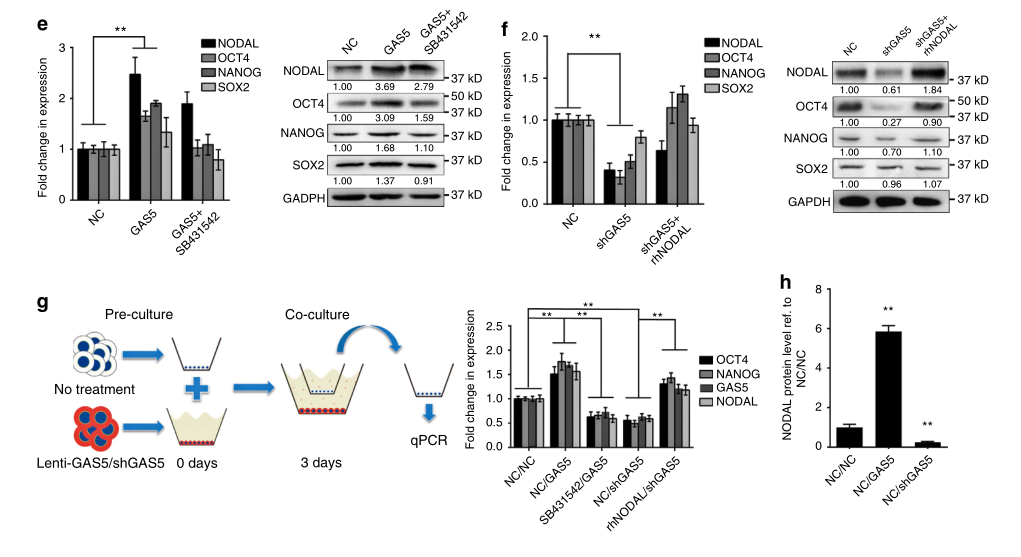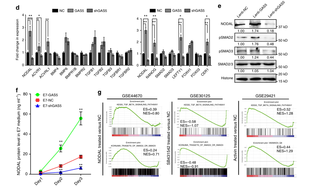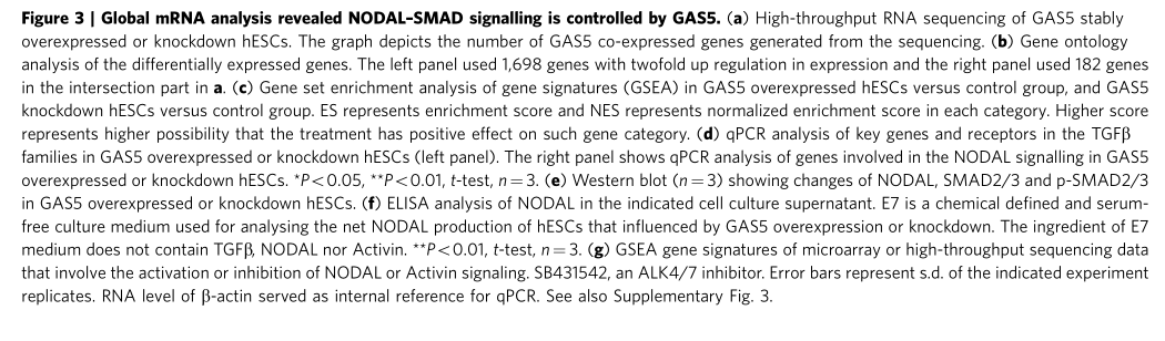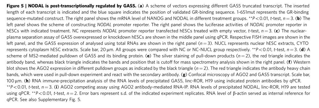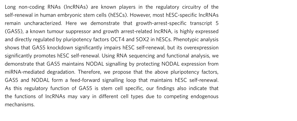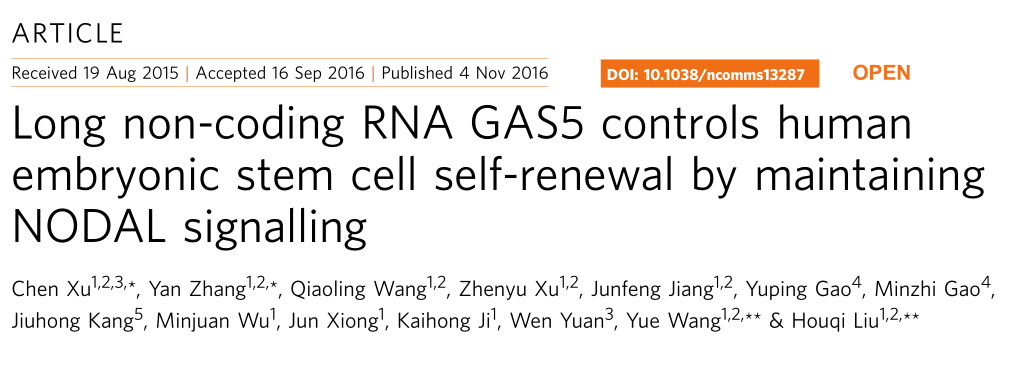 Xu C, et al. Long non-coding rna gas5 control human embryonic stem cell self renewal by maintaining nodal signaling. Nat Commun.?2016 Nov 4;7:13287. (IF=12.124)