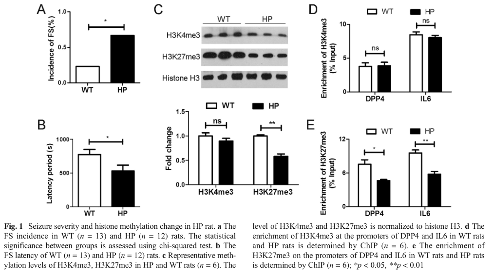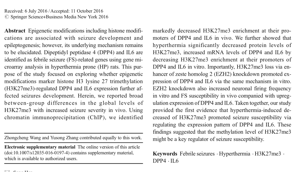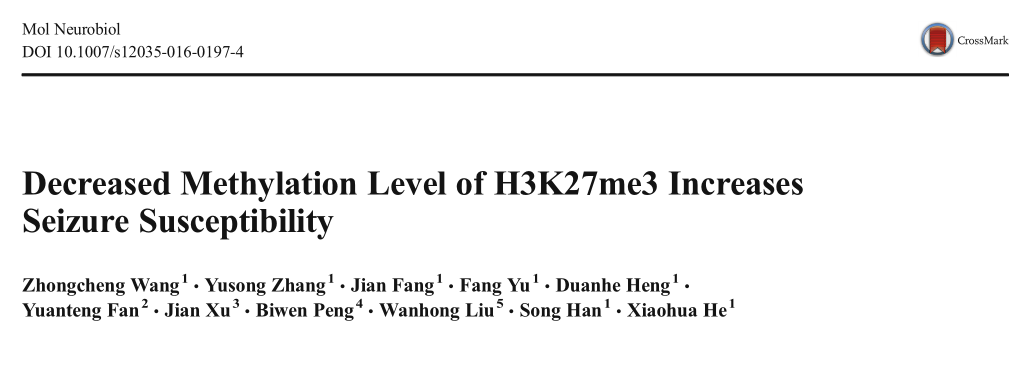 Wang, Z. et al. Decreased Methylation Level of H3K27me3 Increases Seizure Susceptibility. Mol Neurobiol. 2016 Nov :1-10. doi:10.1007/s12035-016-0197-4 (IF=6.19)