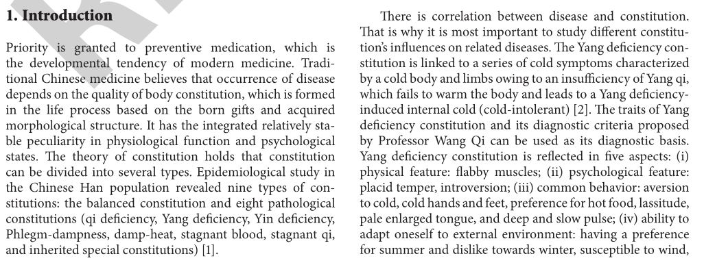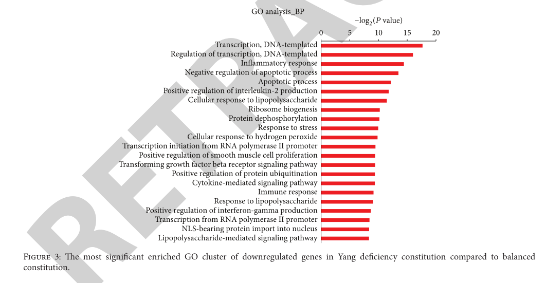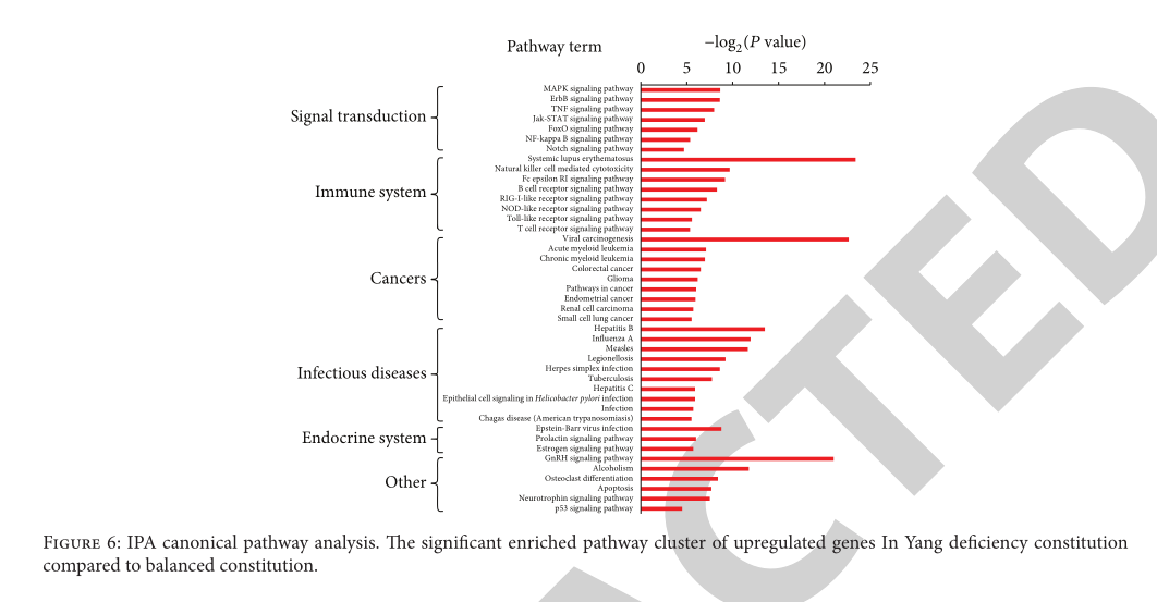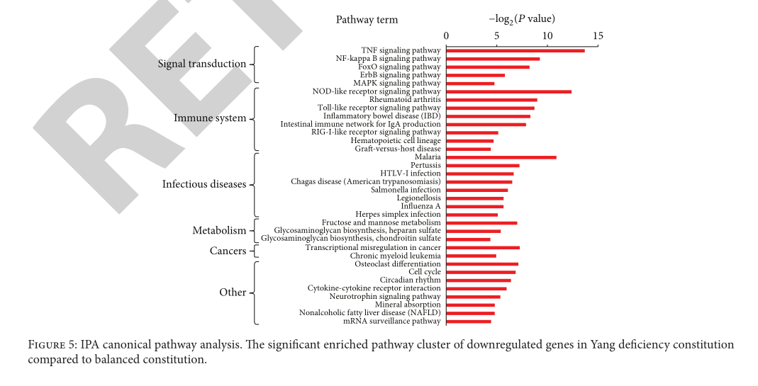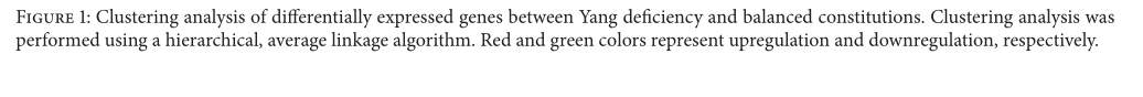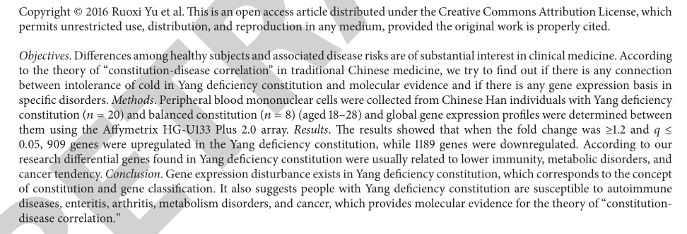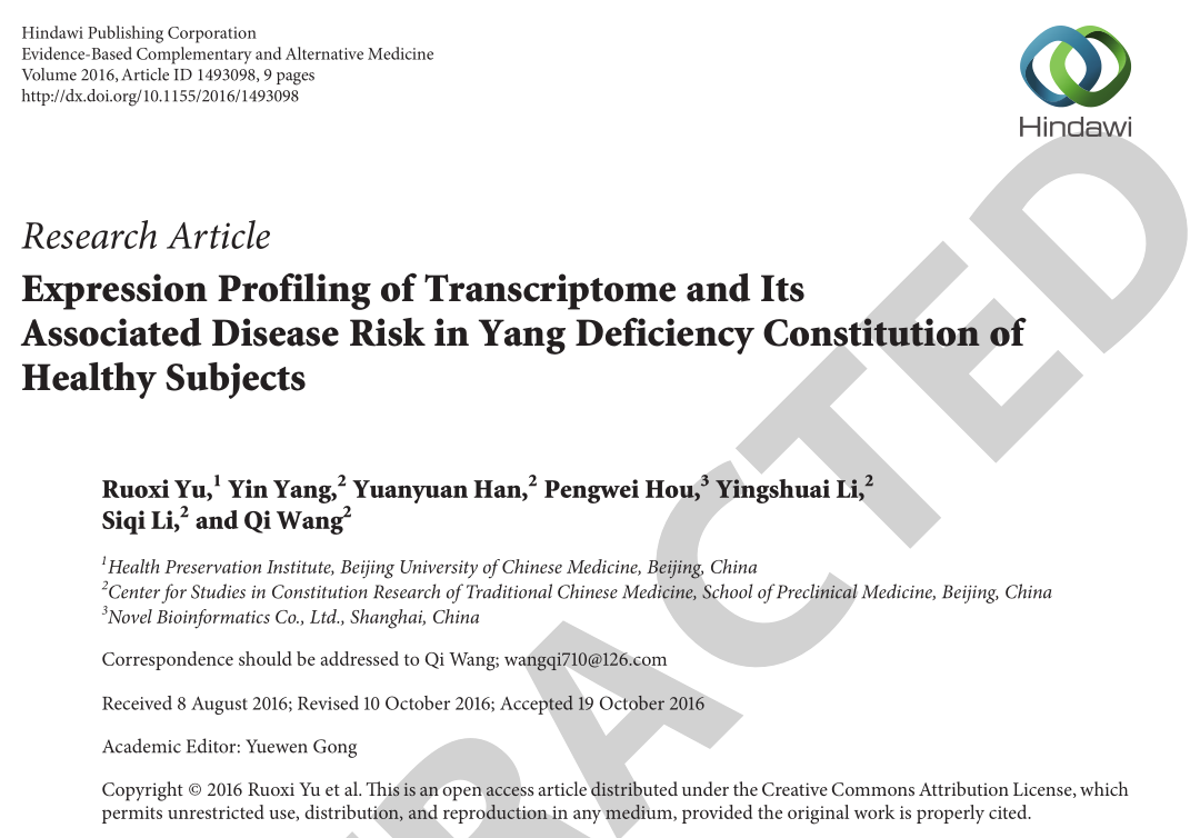 Yu, R., et al. Expression Profiling of Transcriptome and Its Associated Disease Risk in Yang Deficiency Constitution of Healthy Subjects. Evidence-Based Complementray and Alternative Medicine. 2016. Nov:1493098. (IF=1.74)