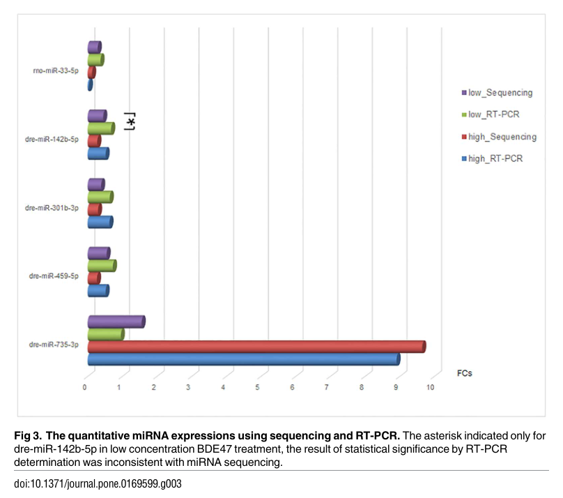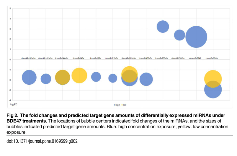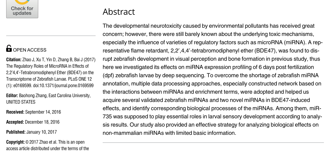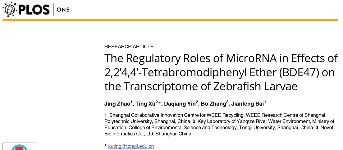 Zhao, J., Xu, T., Yin, D., Zhang, B. & Bai, J. The Regulatory Roles of MicroRNA in Effects of 2,2’4,4'-Tetrabromodiphenyl Ether (BDE47) on the Transcriptome of Zebrafish Larvae. PLoS One 2017 Jan;12(1):e0169599. (IF=2.806)