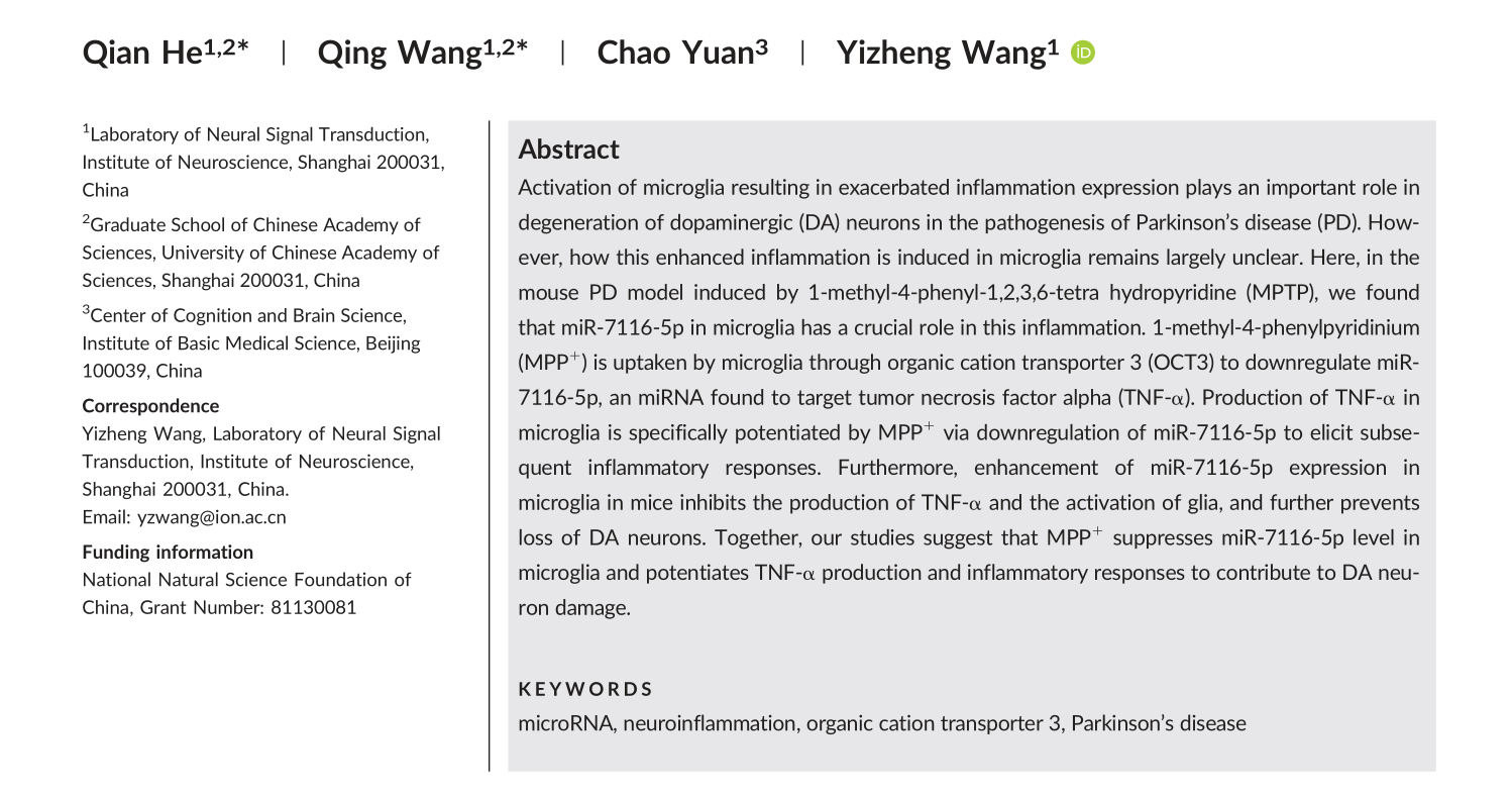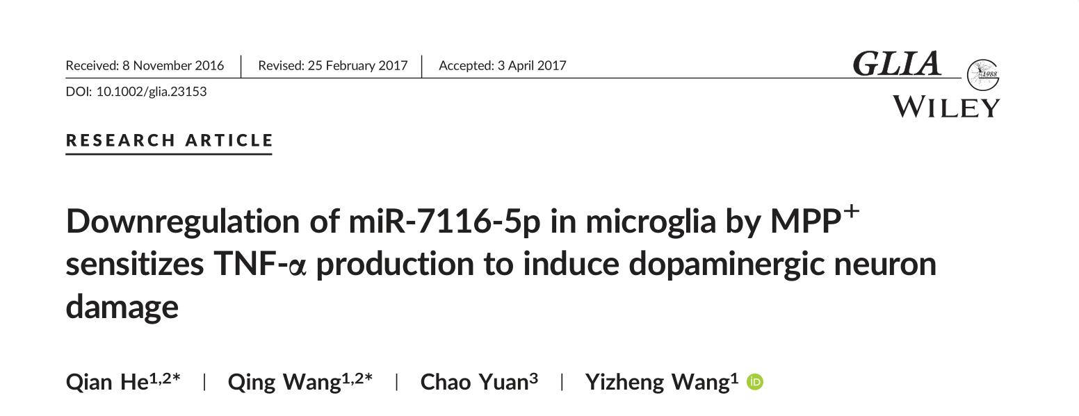 He Q, et al. Downregulation of miR-7116-5p in microglia by MPP1 sensitizes TNF-a production to induce dopaminergic neuron damage. Glia. 2017 Aug;65(8):1251-1263. (IF=6.2)