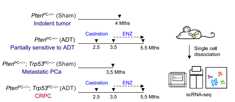 Pten; Trp53雙敲除小鼠(2.5月齡去勢隨后2個(gè)月的ENZ治療);去勢抵抗性前列腺腫瘤(CRPC)
