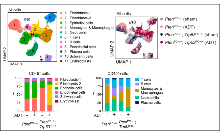 非免疫細(xì)胞(CD45-)中,Pten; Trp53雙敲除小鼠(ADT治療,即CRPC組)中發(fā)生了上皮細(xì)胞和成纖維細(xì)胞-1數(shù)目的減少以及成纖維細(xì)胞-2數(shù)目的增加;免疫細(xì)胞群體(CD45+)中,Pten; Trp53雙敲除小鼠(ADT治療,即CRPC組)發(fā)生了中性粒細(xì)胞數(shù)量減少,并有單核細(xì)胞增多的趨勢,T 細(xì)胞組成的變化與小鼠前列腺的疾病狀態(tài)沒有明顯的相關(guān)性,支持小鼠PCa中的免疫抑制TME。