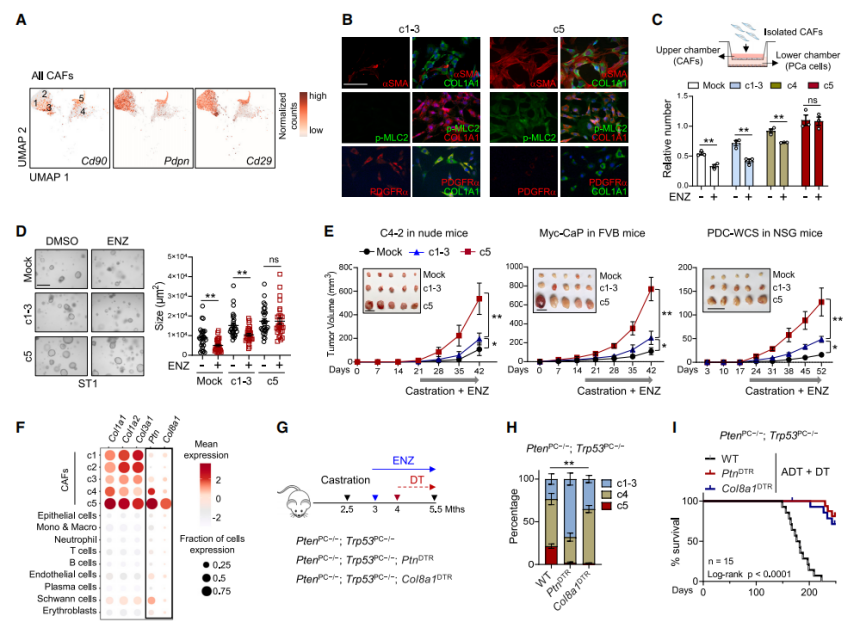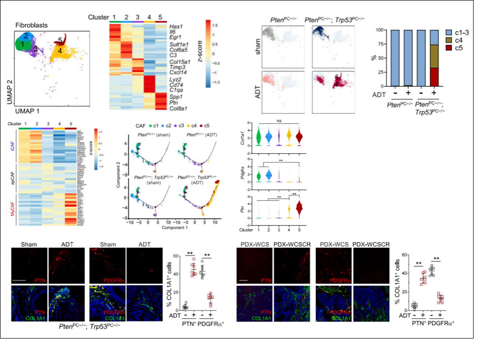 使用Marker基因Col1a1,Ptn,Pdgfra區(qū)分CAF亞群,免疫熒光染色結(jié)果表明,c1-2和c4-5在使用ADT治療和非治療組中,占比存在顯著差異,PDXs造模實(shí)驗(yàn)中也驗(yàn)證了此結(jié)果,其中PDGFRα- PTN+ COL1A1+ 代表的c4和c5 CAFs約占耐藥腫瘤中總CAFs的30%。